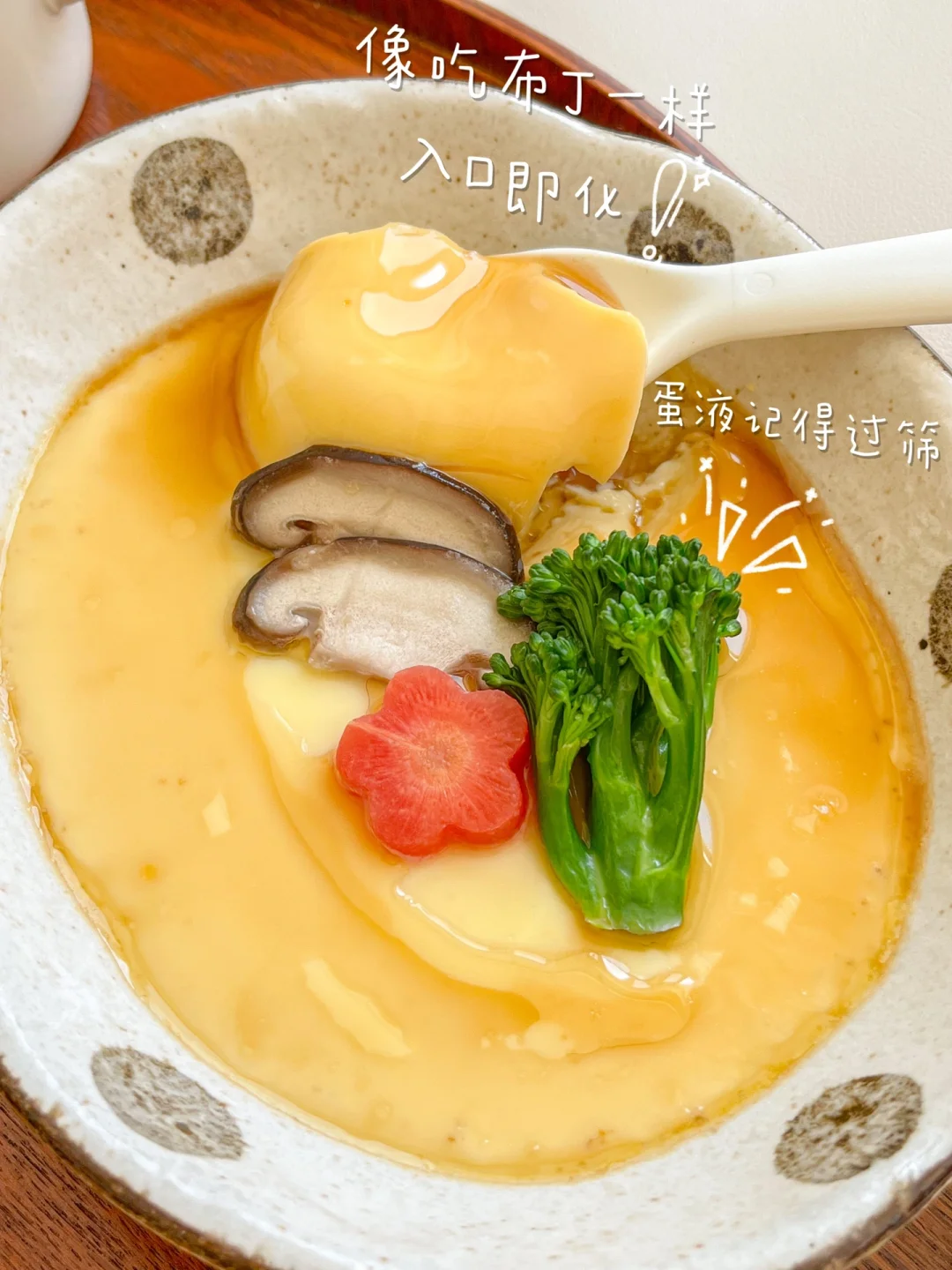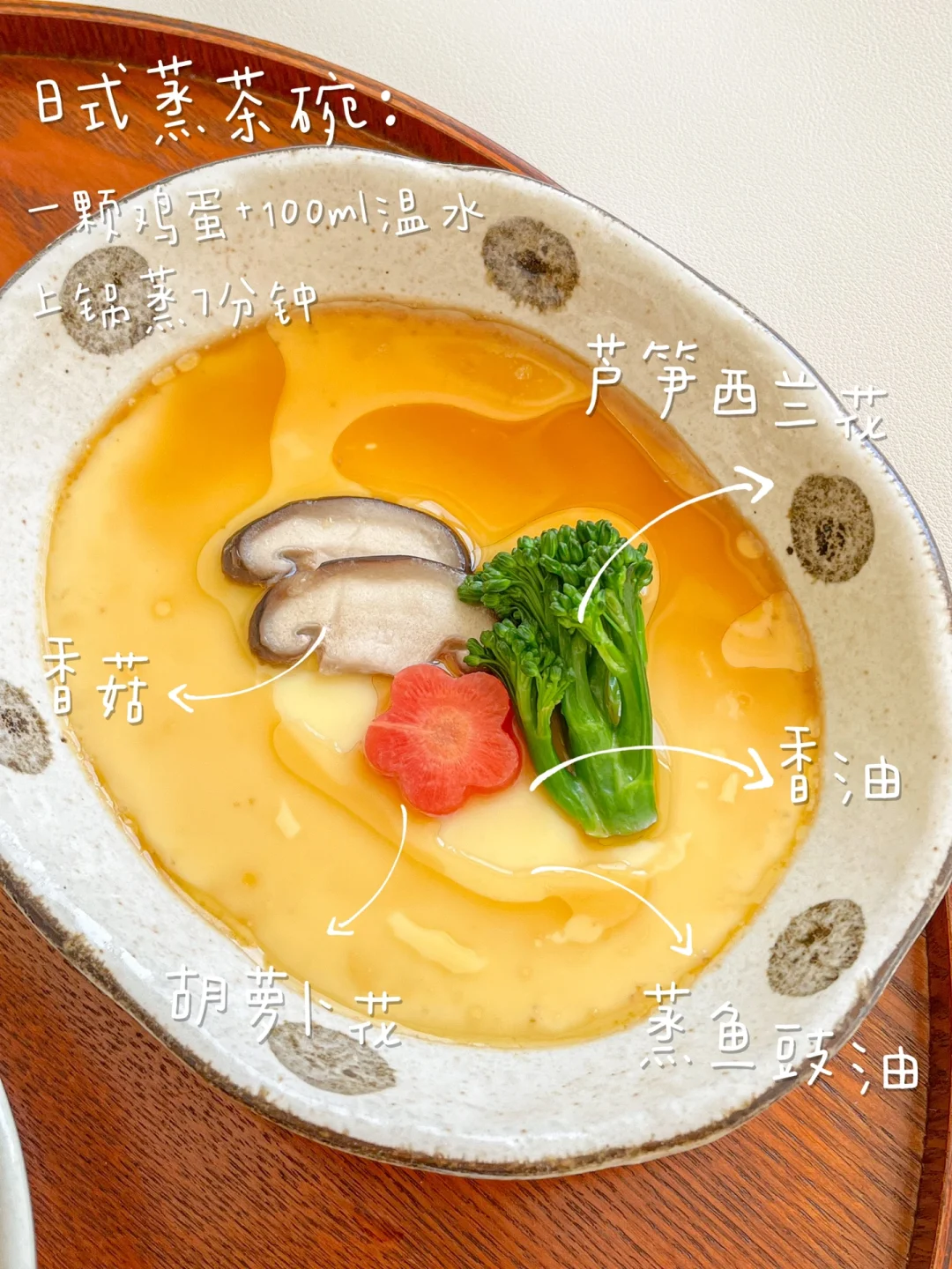 日式蒸茶碗就是在水蒸蛋里加了木鱼花汤汁、味淋,更鲜美了!蒸蛋的万能公式就是一颗鸡蛋配100毫升的温水,做出来就是布丁一样的口感!从来没翻车过[萌萌哒R]口感鲜甜嫩滑,减脂期来一碗,真的很幸福!
