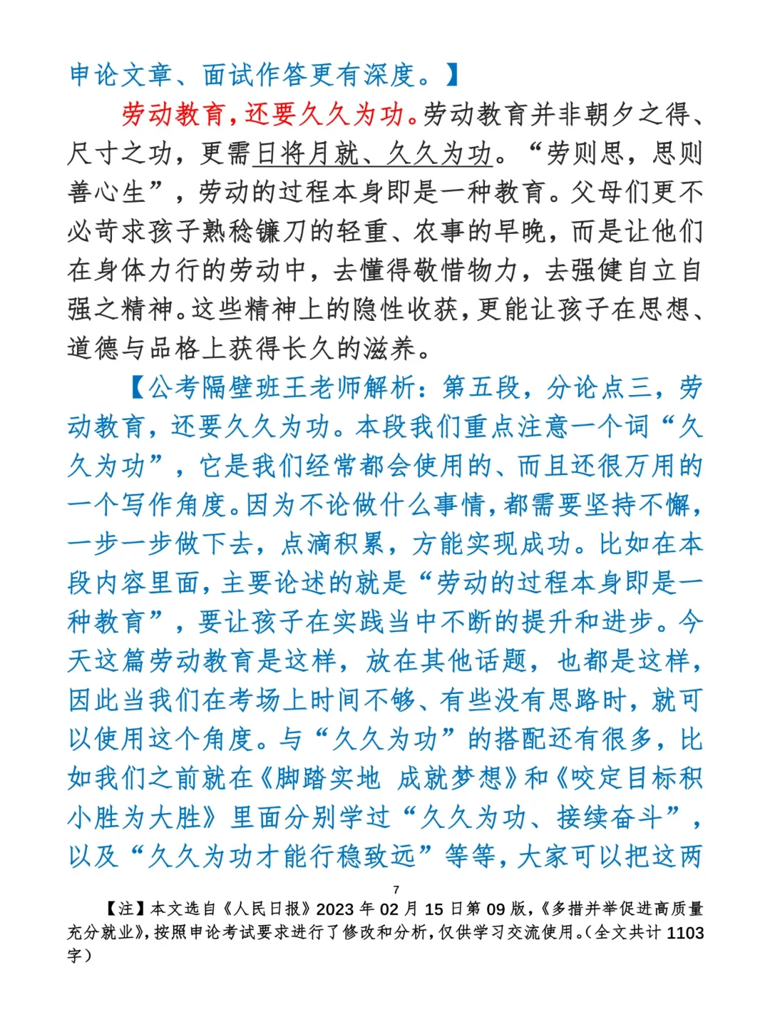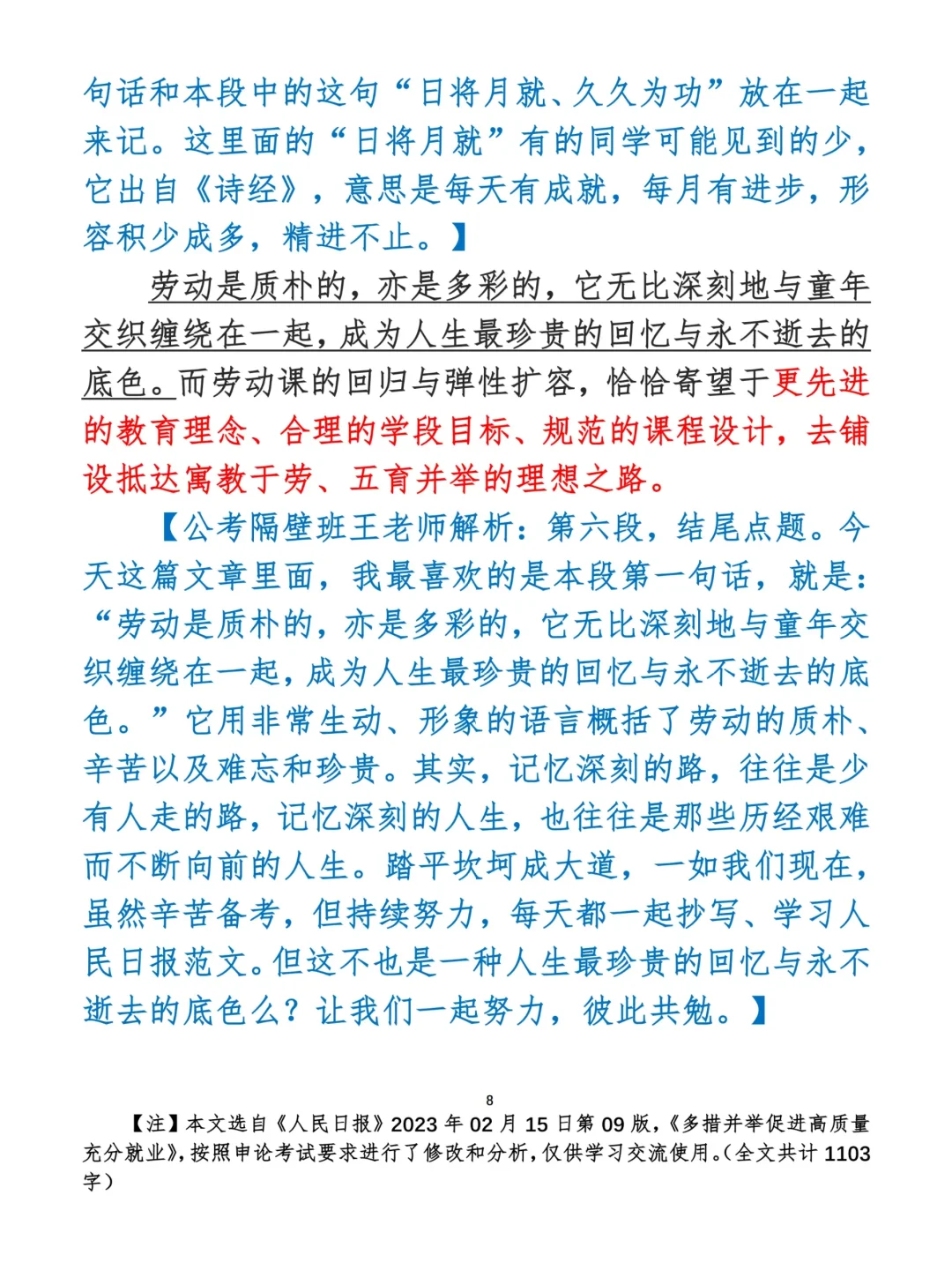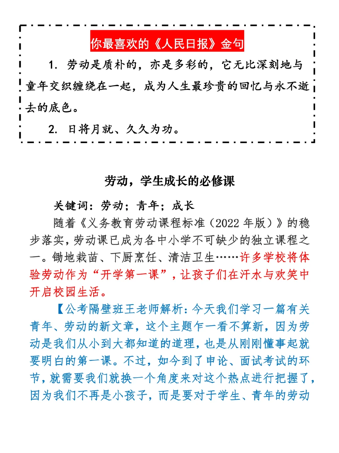 如何抄写:每日抄写文章发在“公考隔壁班王老师”账号,红色字是重点句和结构句,黑色字是正文,蓝色字是解析,大家抄写时不必抄蓝色字。建议先通读全文,做到心中有数再开始抄写,效果会更好。
