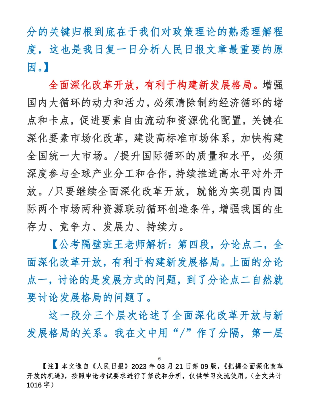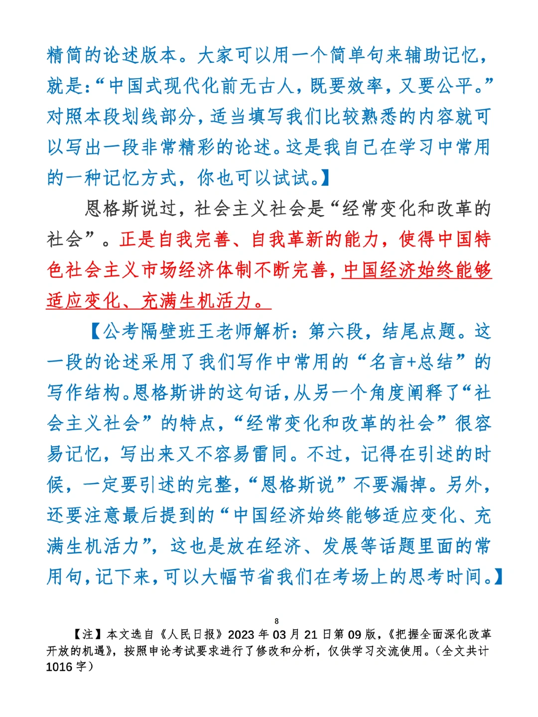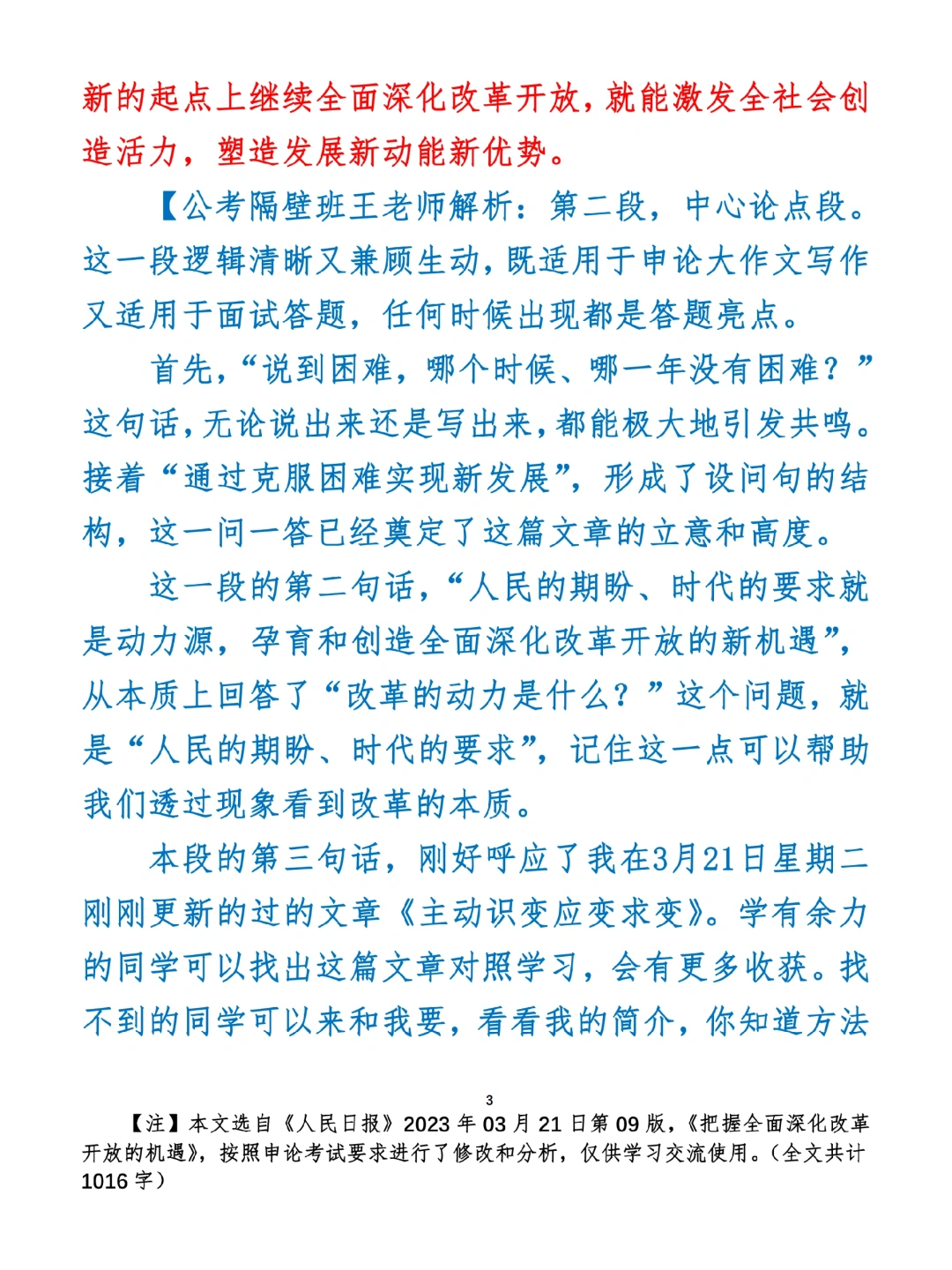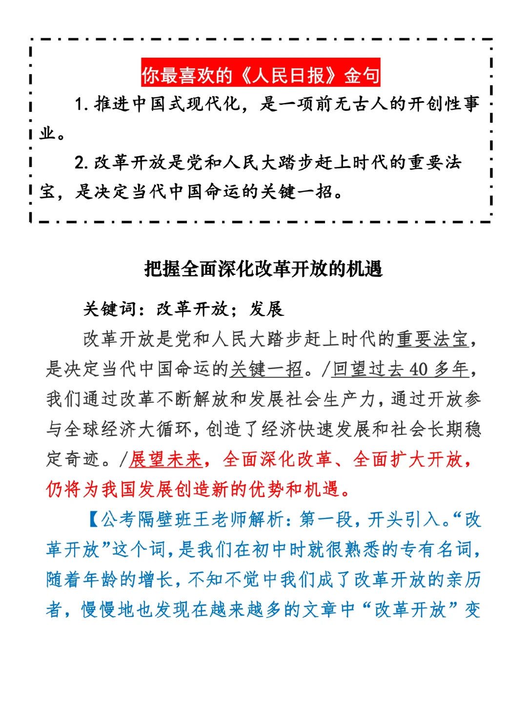 今日打卡作业: 1. 选一句你最喜欢的金句 2. 抄写全文红字+划线部分内容 3. 写完后在留言区打卡 ⭐️ ⭐️ ⭐️ ⭐️ ⭐️ ⭐️ 如何抄写:每天的抄写文章以图片形式发在“公考隔壁班王老师”账号,红色字是重点句和结构句,黑色字是正文,蓝色字是解析,大家抄写时不必抄蓝色字。建议先通读全文(包括蓝色解析部分),做到心中有数再开始抄写,效果会更好。 关于文章:抄写文章来源于人民日报,但每篇文章我都根据申论考试要求进行了修改,主要集中在四个方面:一是重写或修改开头、结尾;二是统一段首句句式结构;三是调整段落字数,使文章结构更均衡;四是简化复杂长难句,使之更具可模仿性。每篇文章修改幅度不同,无论修改多少,都是基于申论考试要求,毫无对人民日报文章品评之意。(此处致敬人民日报) 关于解析:我会在文章每段后面加一段蓝色字的解析,是我自己在抄写时的感悟,篇幅时间有限,不能面面俱到,但求重点突出。如果你有其他感悟,也希望能在评论里分享,我们相互学习、共同进步。 ⭐️ ⭐️ ⭐️ ⭐️ ⭐️ ⭐️ 这里是公考隔壁班王老师独创的“每天半小时・申论80分”抄写团,欢迎加入我们!