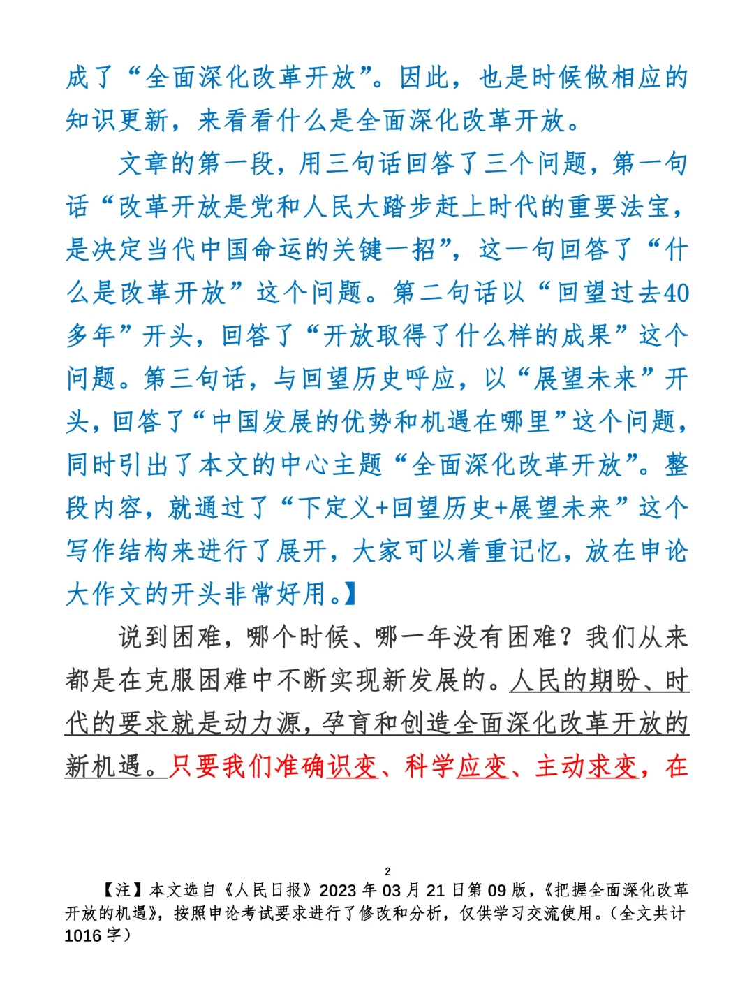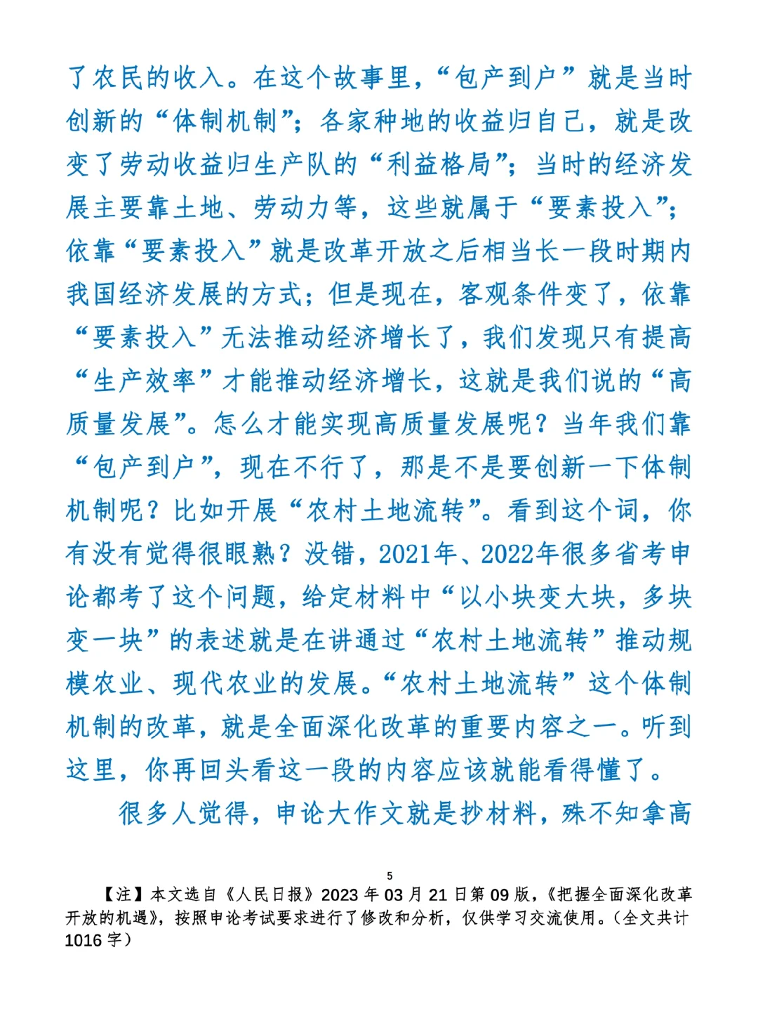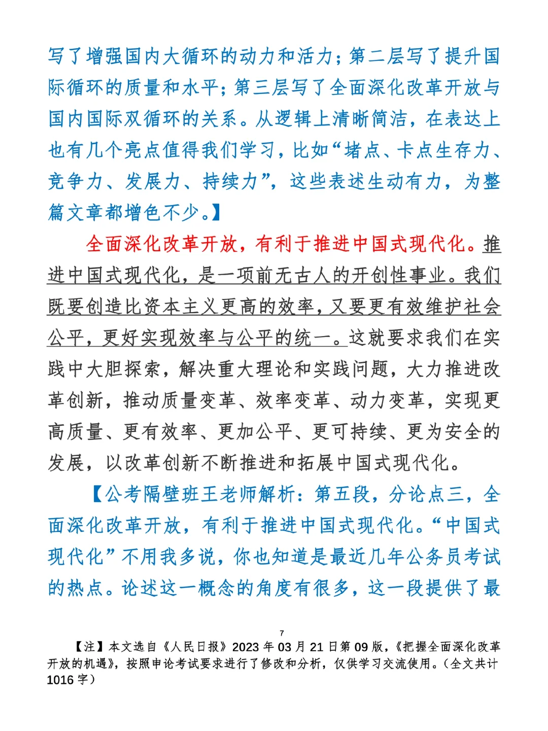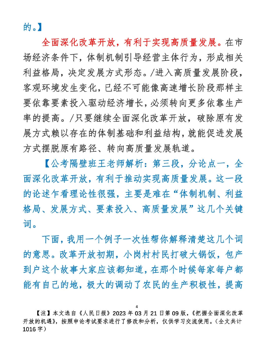 今日打卡作业: 1. 选一句你最喜欢的金句 2. 抄写全文红字+划线部分内容 3. 写完后在留言区打卡 ⭐️ ⭐️ ⭐️ ⭐️ ⭐️ ⭐️ 如何抄写:每天的抄写文章以图片形式发在“公考隔壁班王老师”账号,红色字是重点句和结构句,黑色字是正文,蓝色字是解析,大家抄写时不必抄蓝色字。建议先通读全文(包括蓝色解析部分),做到心中有数再开始抄写,效果会更好。 关于文章:抄写文章来源于人民日报,但每篇文章我都根据申论考试要求进行了修改,主要集中在四个方面:一是重写或修改开头、结尾;二是统一段首句句式结构;三是调整段落字数,使文章结构更均衡;四是简化复杂长难句,使之更具可模仿性。每篇文章修改幅度不同,无论修改多少,都是基于申论考试要求,毫无对人民日报文章品评之意。(此处致敬人民日报) 关于解析:我会在文章每段后面加一段蓝色字的解析,是我自己在抄写时的感悟,篇幅时间有限,不能面面俱到,但求重点突出。如果你有其他感悟,也希望能在评论里分享,我们相互学习、共同进步。 ⭐️ ⭐️ ⭐️ ⭐️ ⭐️ ⭐️ 这里是公考隔壁班王老师独创的“每天半小时・申论80分”抄写团,欢迎加入我们!