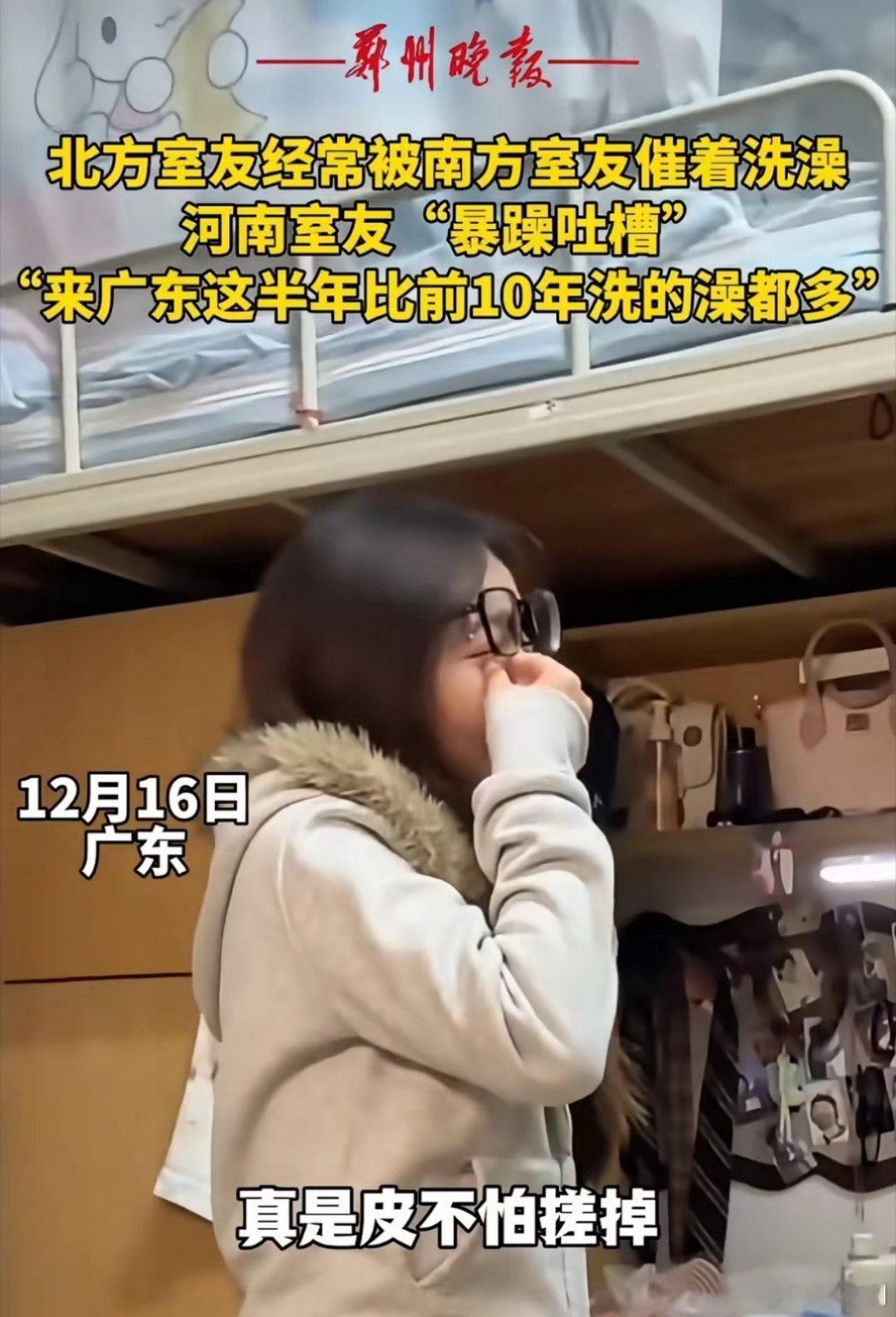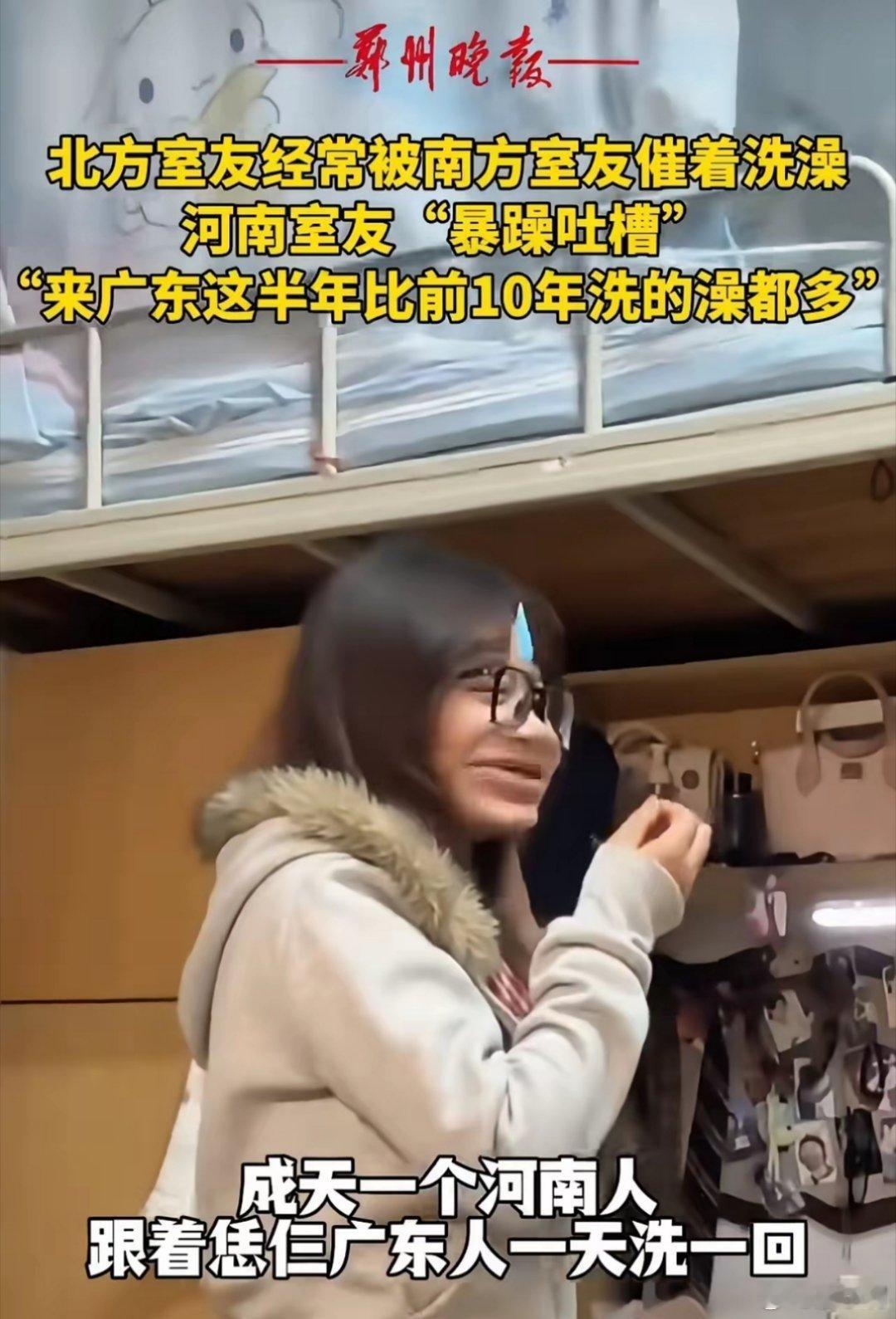 河南女孩吐槽经常被南方室友催着洗澡南方叫冲凉,天气闷热湿润,睡觉前冲一下,感觉才舒服,北方人叫洗澡,一般洗的时间久,加之气候干燥一般也不会天天洗,特别冬季更不会。这只是南北方人不同的生活习惯而已,互相尊重就好。热点观点