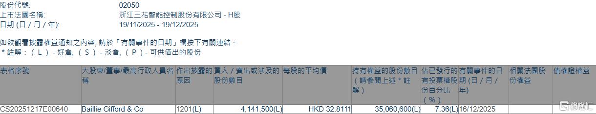 格隆汇12月19日丨根据联交所最新权益披露资料显示,2025年12月16日,三花智控(02050.HK)遭BaillieGifford&Co在场内以每股均价32.8111港元减持414.15万股,涉资约1.36亿港元。