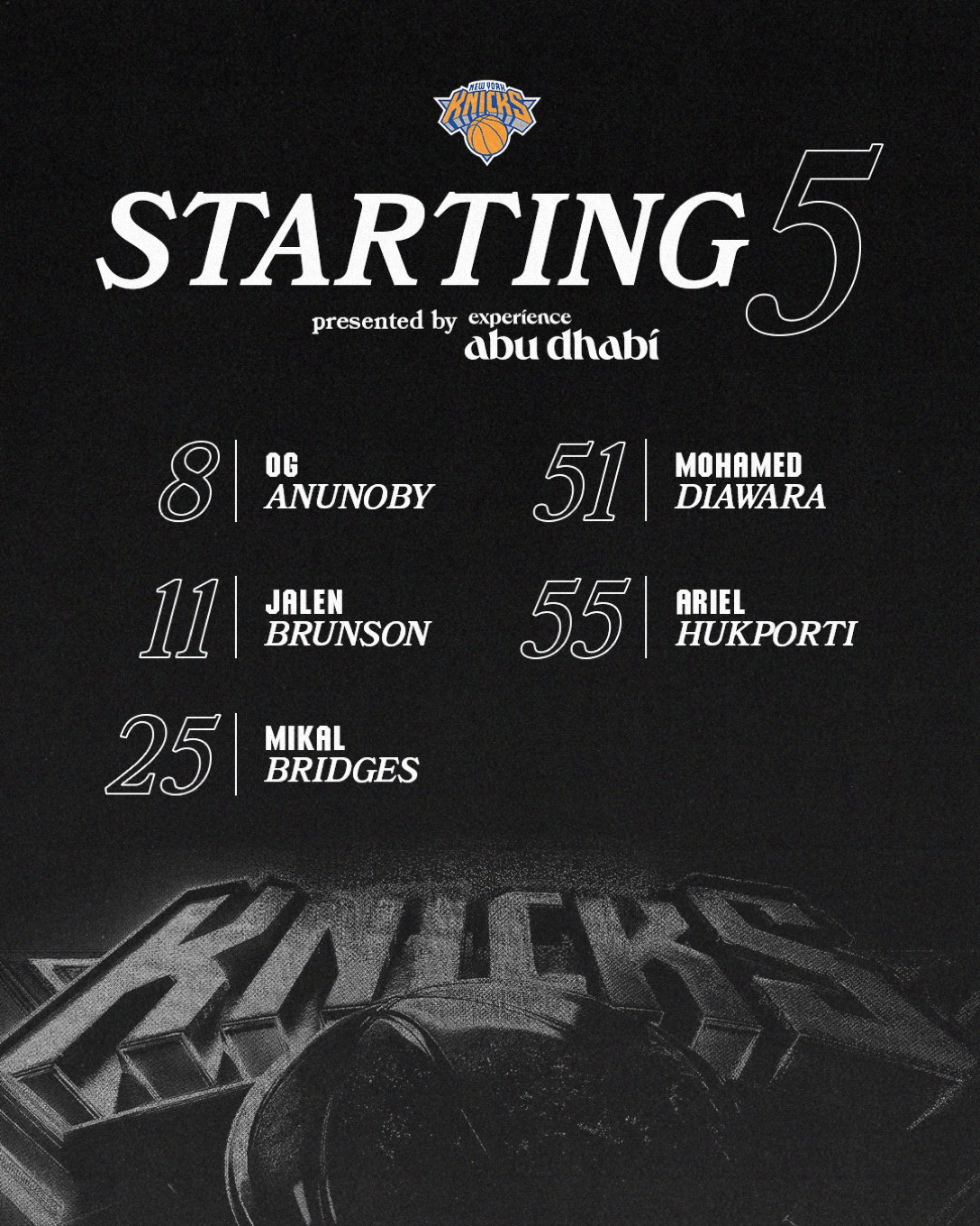 尼克斯首发:布伦森、OG、布里奇斯、迪亚瓦拉、胡克波尔蒂