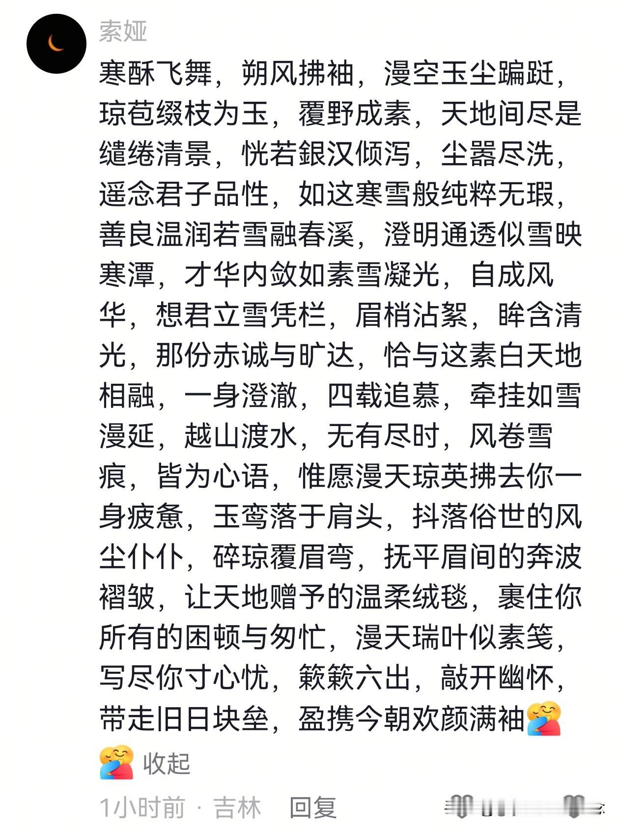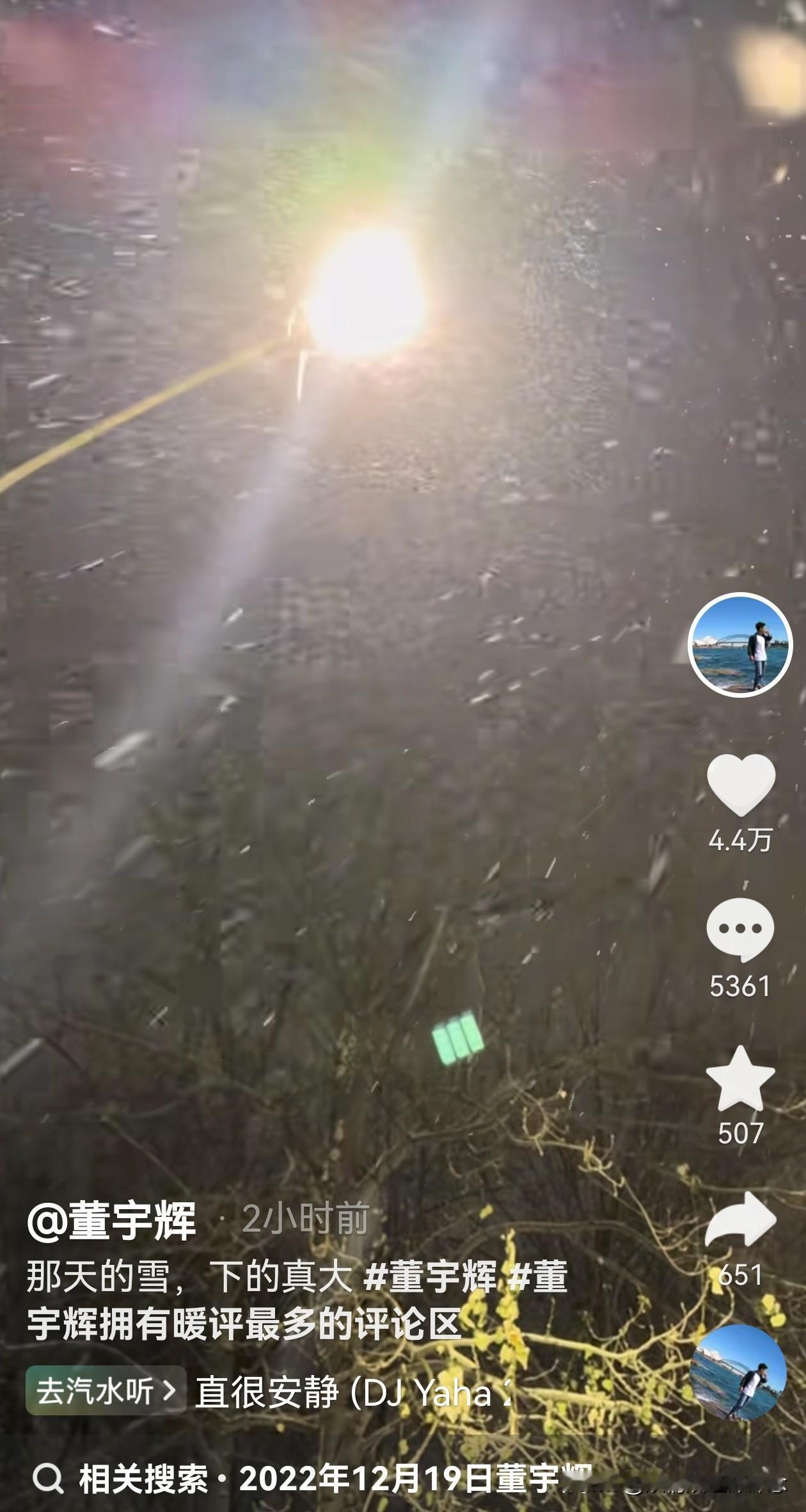 凌晨4点38分, 董宇辉还在看雪, 评论区的网友可着急了, 问他为什么还不睡, 是不是恋爱了? 我猜是昨天喝茶喝多了,睡不着。 有多少同学被昨天晚上那段喝茶的直播逗笑了,宇辉又烫手又烫嘴,真不像演的。 都说宇辉喝茶太多睡不着,可不是嘛,凌晨了还不睡,发个看雪的抖音,配个抒情的歌曲,果然是“醉”了。 再配上索娅的美文,这个早上瞬间有了好心情。预祝今天的直播顺利,福建行完美收官! 董宇辉 与辉同行
