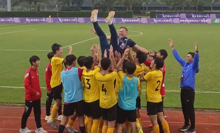 恒大足校U15夺冠后将主帅萨沙-米莱莫维奇扔起庆祝