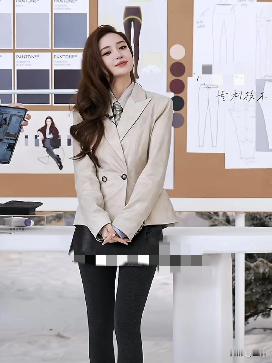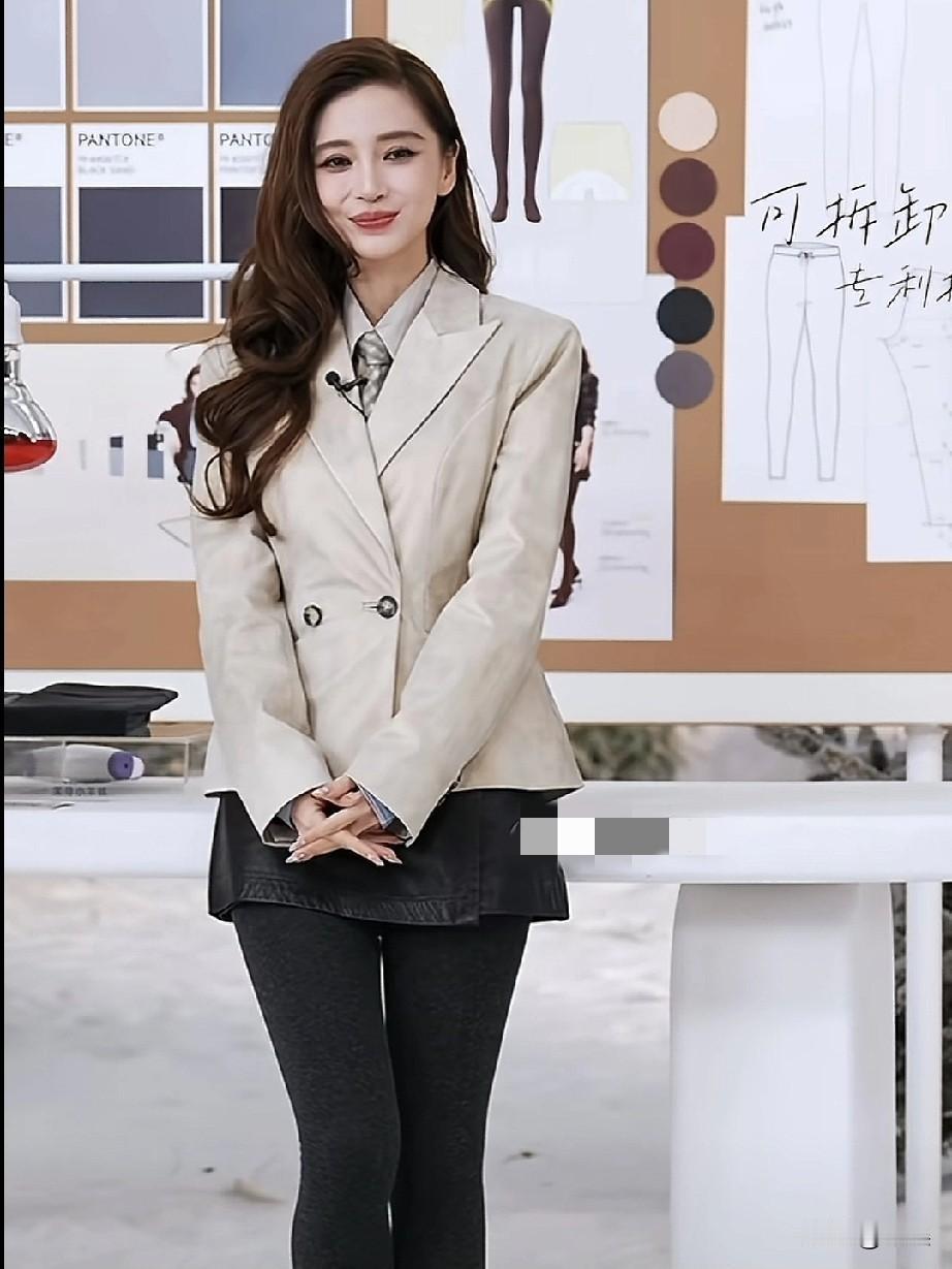 直播间里的杨颖,即使高跟鞋带来不便,她也用温柔笑容和贴心态度化解,浅米色西装搭配小皮裙的造型