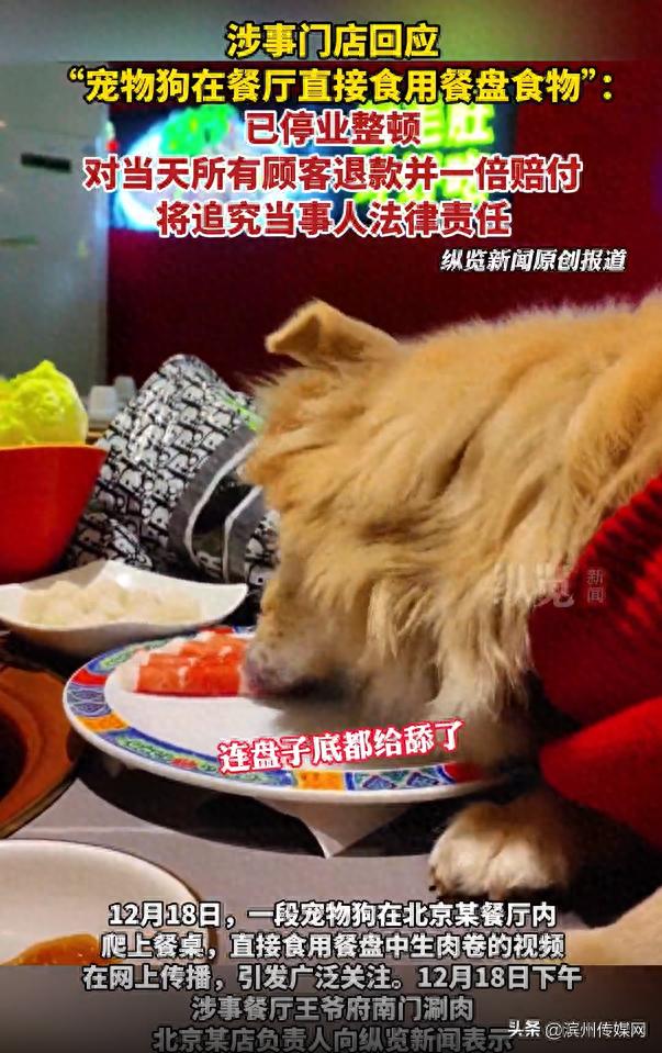 12月18日,一段宠物狗在北京某餐厅内爬上餐桌,直接食用餐盘中生肉卷的视频在网上传播,引发广泛关注。12月18日下午,涉事餐厅王爷府南门涮肉北京某店负责人向纵览新闻表示,事件发生于12月16日晚,目前该店已停业整顿,并对当日所有就餐顾客退款且一倍赔付,同时将追究该事件行为人的法律责任。