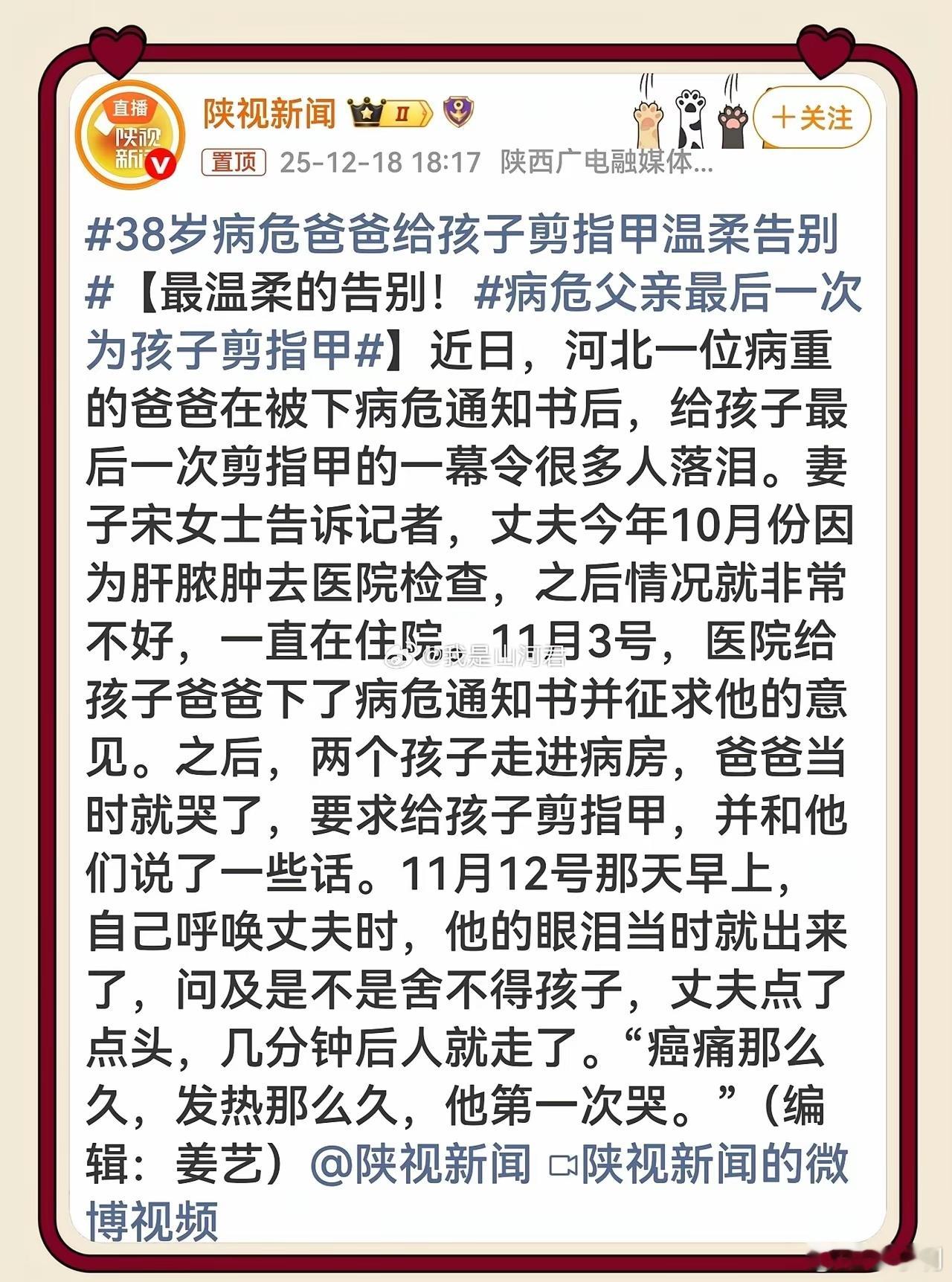 38岁病危爸爸给孩子剪指甲温柔告别这一幕看哭无数中年男人,有时候真的不是怕死,是担心死了之后孩子怎么办?父爱从不是惊天动地,而是拼尽最后力气,也要为孩子留一份周全。愿天堂没有病痛,也愿每个孩子都能珍惜眼前的陪伴!热点观点