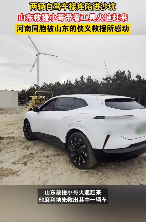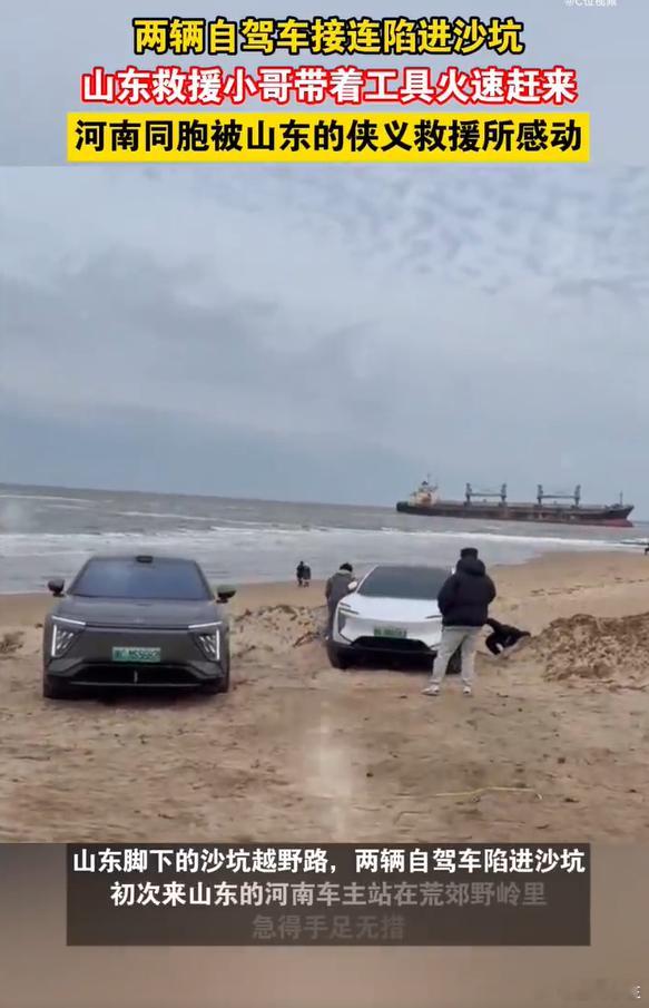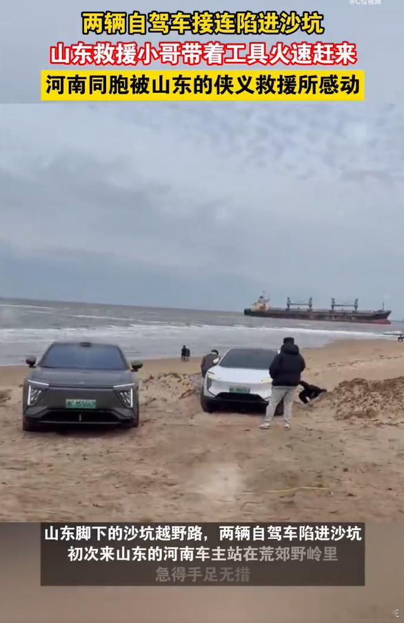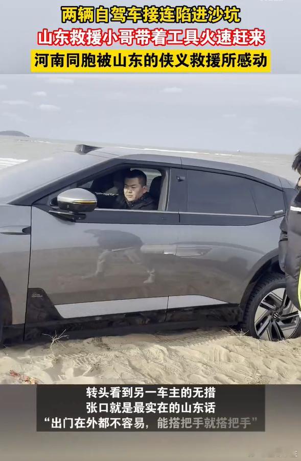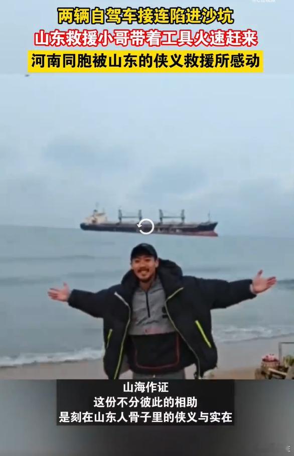河南同胞被山东的侠义救援所感动 自驾途中遇困境,河南车主陷沙坑手足无措。山东救援小哥火速到场,麻利搞定救援,还帮忙联系拖车、安排保障车,全程守到交接,实在与热忱让人动容。
