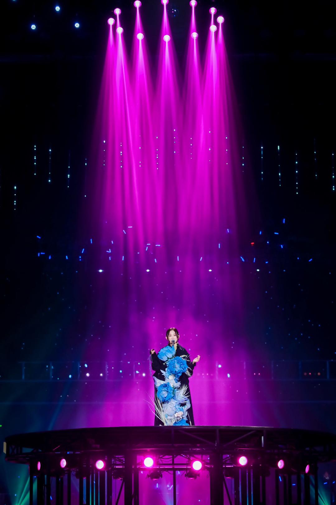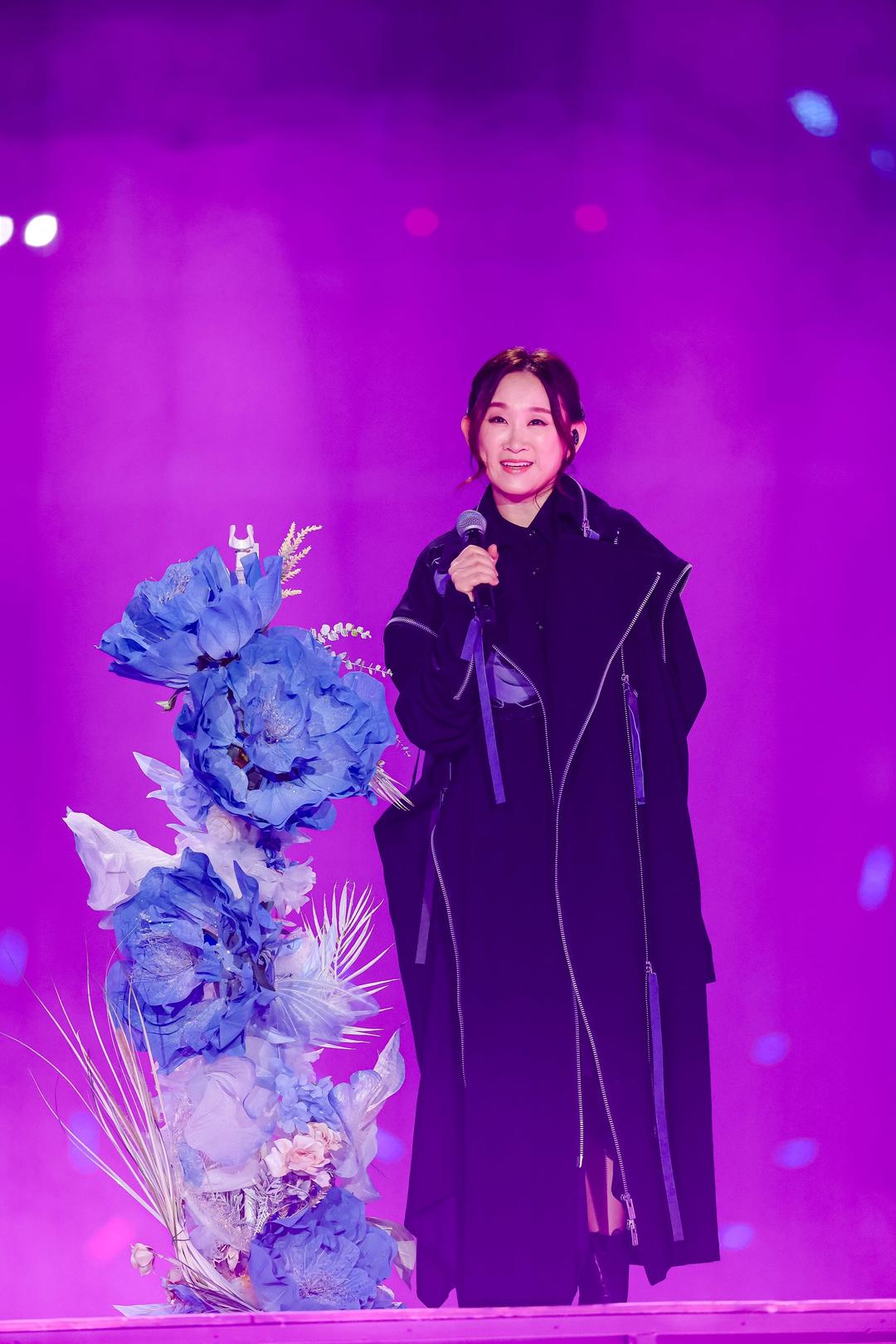 舞台上,立麦架被精心装饰成一株含苞待放的花枝,随着歌曲的推进,装置如约“开花”,与歌词“那棵树开花了”完美呼应。王菀之在演唱中与这朵“花”温柔互动,将现场气氛推向诗意般的高潮。