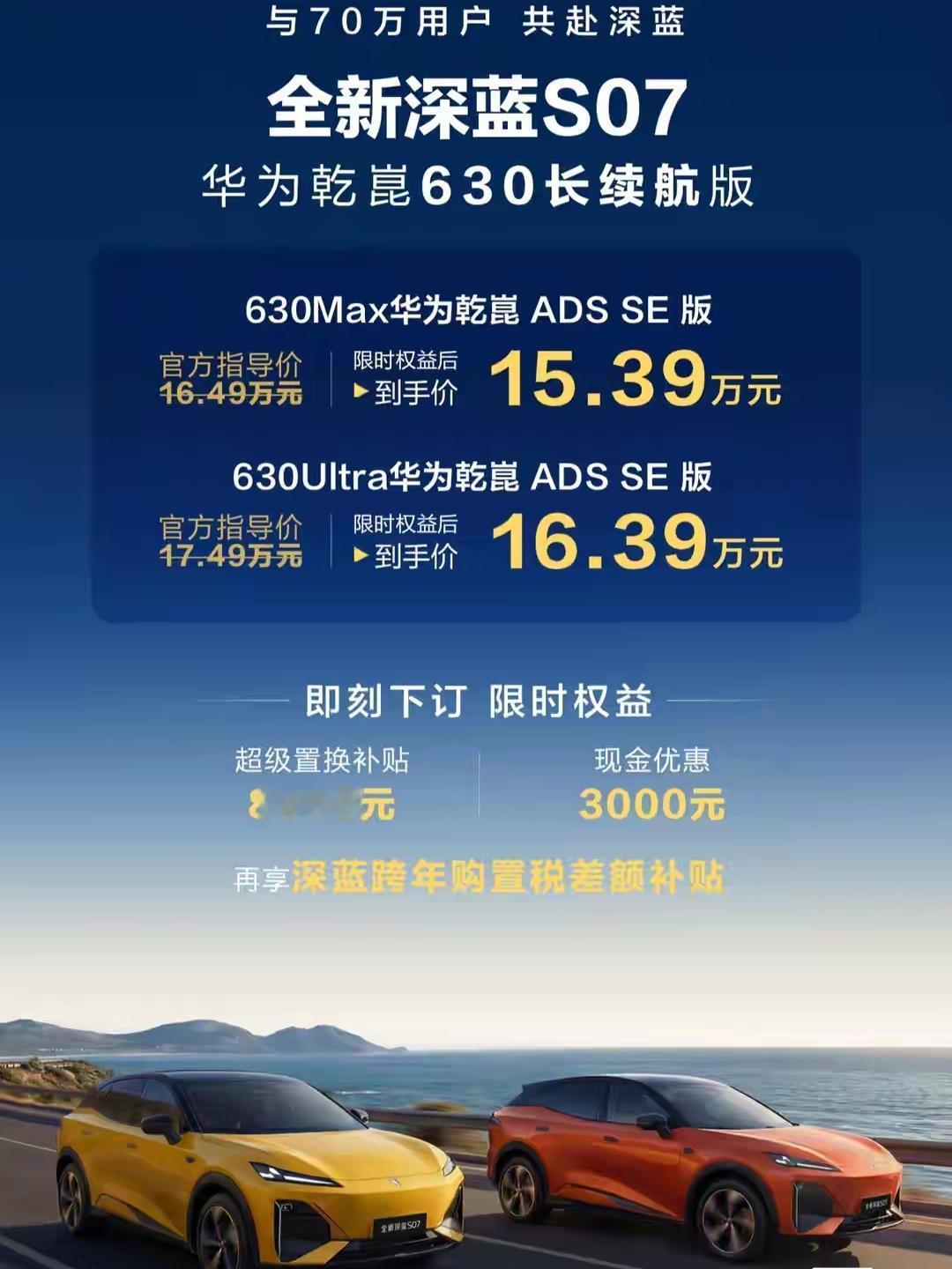 零跑C11没想到,尚界H5没想到,长安马自达EZ-60没想到,连广汽埃安AION i60也没想到,当它们以先进时尚,智能舒适,价格亲民在SUV市场拼尽全力时,那个超级增程超级省的长安深蓝S07华为乾崑长续航版,重磅来袭,630超长续航,叠加优惠后限时到手价仅为15.39~16.39万元。 深蓝S07华为乾崑长续航版上市 12月11日,全新深蓝S07华为乾崑630长续航版正式上市,凭借价格、设计、空间、智能等多方面亮点,成为新能源市场关注焦点。 新车官方指导价16.49万-17.49万,限时权益价15.39万元起,叠加现金直降、置换补贴,还赠送价值5000元的华为乾崑ADS SE高阶包,性价比突出。 全新深蓝S07外观延续家族式风格,流畅线条搭配双色车身、悬浮式车顶,新增的华为智能交互灯组可自定义灯效,还能投影行人礼让提示。 车身尺寸分别为:4750mm×1930mm×1625mm,轴距2900mm,180cm乘客坐前排头部有一拳多空间,后排腿部空间充裕,轻松满足日常出行需求。 全系标配华为乾崑ADS SE系统,依托3颗毫米波雷达、10颗摄像头及12颗超声波雷达,实现高速领航辅助、城区巡航等功能。搭载的高通骁龙8295P芯片,配合15.6英寸悬浮中控屏与55英寸AR-HUD全息系统,车机操作流畅便捷。 全新深蓝S07长续航纯电版CLTC续航630km,支持3C超快充,15分钟可从30%充至80%,还具备6kW外放电功能。 增程版综合续航最高1385km,应对长途无压力。后置190kW单电机,百公里加速7.5秒,新一代原力超级电驱让电机效率达97.5%,WLTC工况百公里电耗14.2kWh,兼顾动力与节能。 全新深蓝S07新车底盘全系标配FSD可变阻尼减震器和HRS液压式回弹止动器,后悬架铝合金下摆臂提升转向精准度,过弯侧倾更小。 内饰采用“豪华游艇”风格,10.7㎡软包搭配超纤绒感麂皮材质,前排双零重力座椅、副驾14向调节及20个扬声器的杜比全景声系统,营造出舒适豪华的驾乘氛围。 颜值高、性能奭、续航长、智能舒适、节能省钱,过年开全新深蓝S07长续航版出门旅行,有排面,超炫酷!