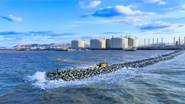 在接收站外围,全长3183.2米的防波堤工程正加速向深海延伸,宛如一道“海上钢铁长城”守护着整个项目。承建单位中交广航局以“百日攻坚”劳动竞赛为抓手,创新管理机制、优化施工方案,持续推动工程建设提质提速。目前,防波堤已成功向深海推进523米,其余2660.2米水下进度完成约70%,工程总体进度超过60%。