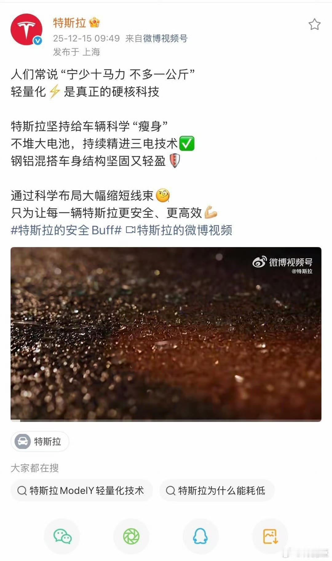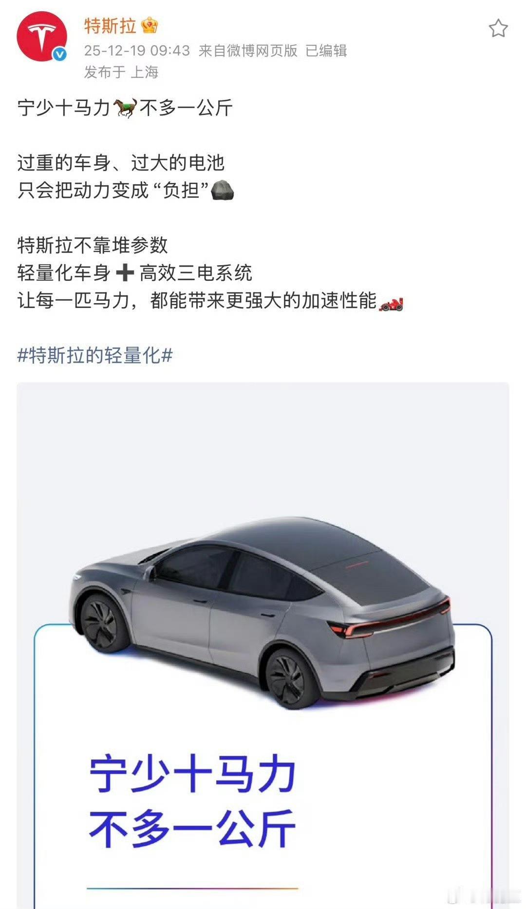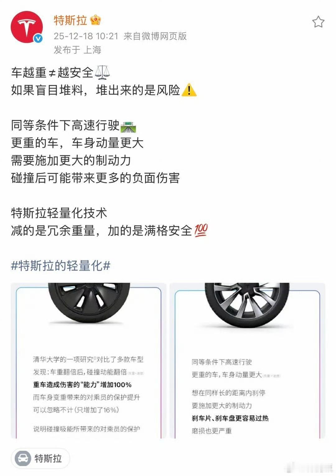 特斯拉连续发布4个车重并不能代表什么的文章!文章直指其他中国车企只知道增重! 特斯拉还进行了相关的对比,但是特斯拉忽略的一点是,他们更高级车辆,其实车型也是挺重的。 车重和车辆的大小以及级别有非常大的关系,如果车辆的级别比较高,那么车重肯定是更重的。因为体型也大,配置也更丰富,使用的高强度钢材比例更高。 各位是怎么看的?欢迎评论区留言。
