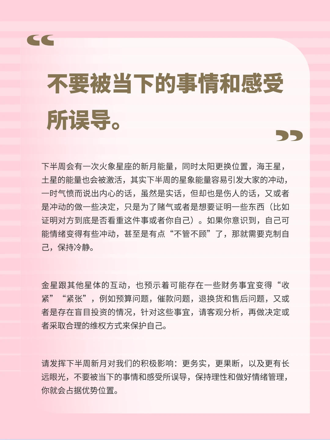 下半周会有一次火象星座的新月能量,同时太阳更换位置,海王星,土星的能量也会被激活,其实下半周的星象能量容易引发大家的冲动,一时气愤而说出内心的话,虽然是实话,但却也是伤人的话,又或者是冲动的做一些决定,只是为了赌气或者是想要证明一些东西(比如证明对方到底是否看重这件事或者你自己)。如果你意识到,自己可能情绪变得有些冲动,甚至是有点“不管不顾”了,那就需要克制自己,保持冷静。