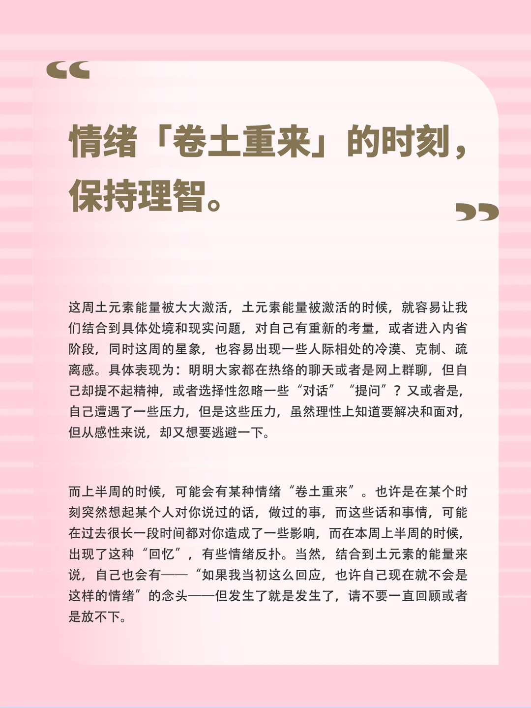 这周土元素能量被大大激活,土元素能量被激活的时候,就容易让我们结合到具体处境和现实问题,对自己有重新的考量,或者进入内省阶段,同时这周的星象,也容易出现一些人际相处的冷漠、克制、疏离感。具体表现为:明明大家都在热络的聊天或者是网上群聊,但自己却提不起精神,或者选择性忽略一些“对话”“提问”?又或者是,自己遭遇了一些压力,但是这些压力,虽然理性上知道要解决和面对,但从感性来说,却又想要逃避一下。