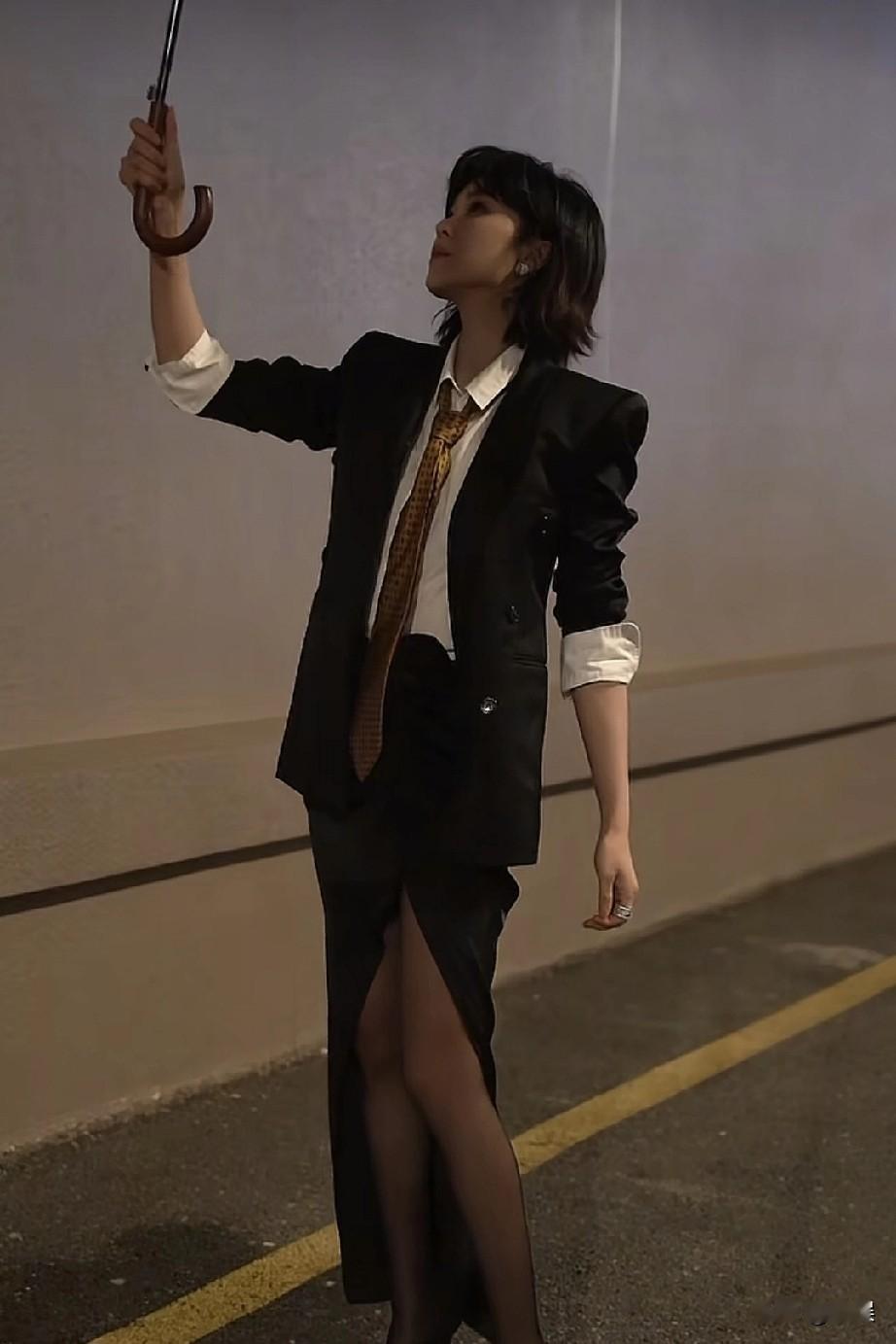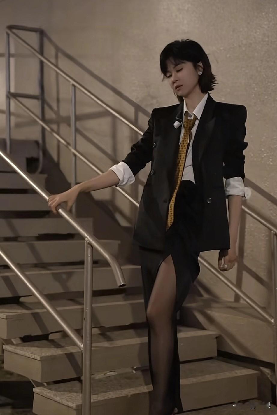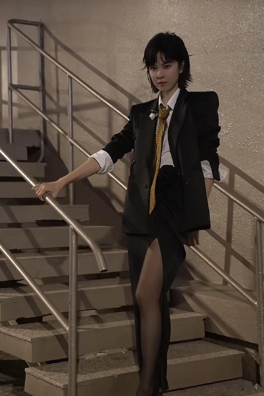 夜色,楼梯作台,郁可唯以一身飒爽西装搭配黑丝。利落短发衬出清冷气质,高开叉裙装