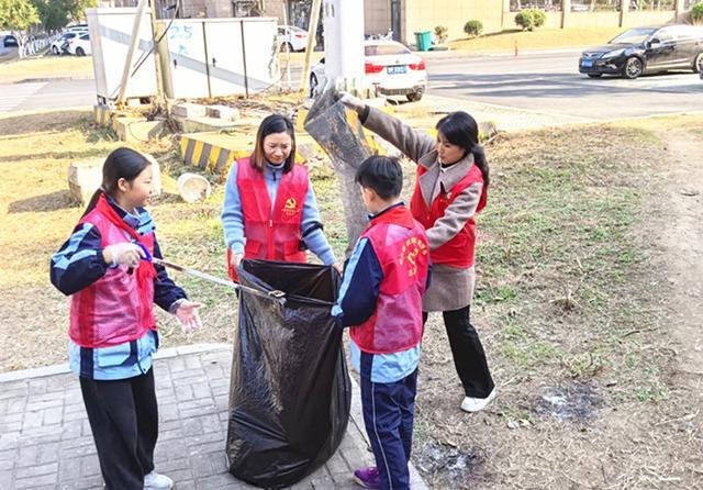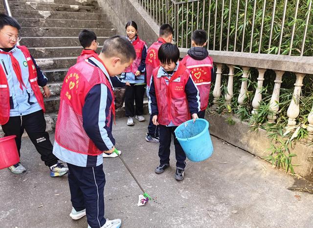 队员们在老师的带领下分组集合,领取扫帚、垃圾夹、垃圾袋等清洁工具。学校周边空地、附近的台阶区域等略显杂乱,大家立即行动起来:有的弯腰用夹子捡拾台阶上的烟头、零食袋,有的手持扫帚清扫角落的积尘与落叶。清理过程中,队员们还主动充当“文明宣传员”,呼吁居民共同维护整洁的居住环境。