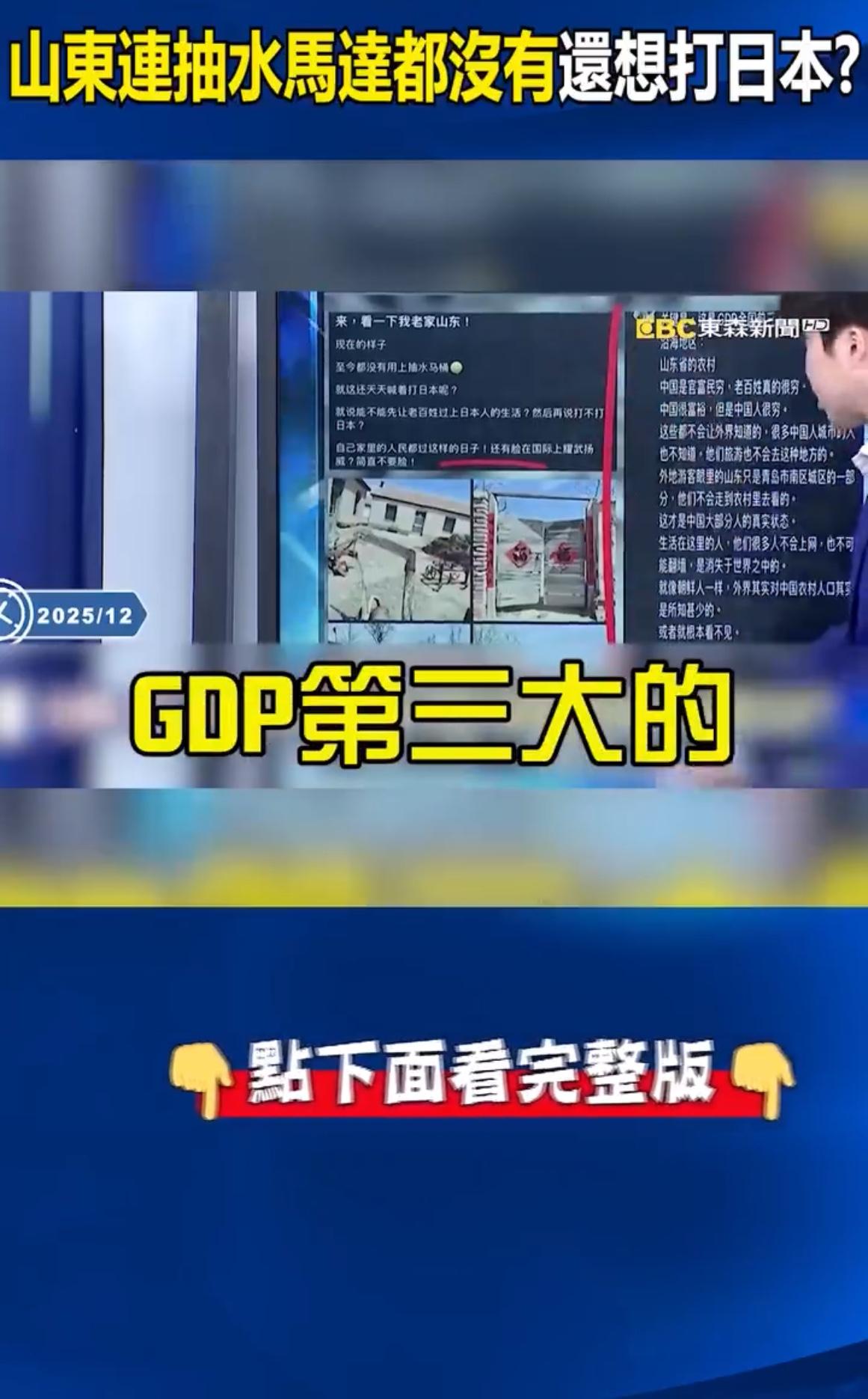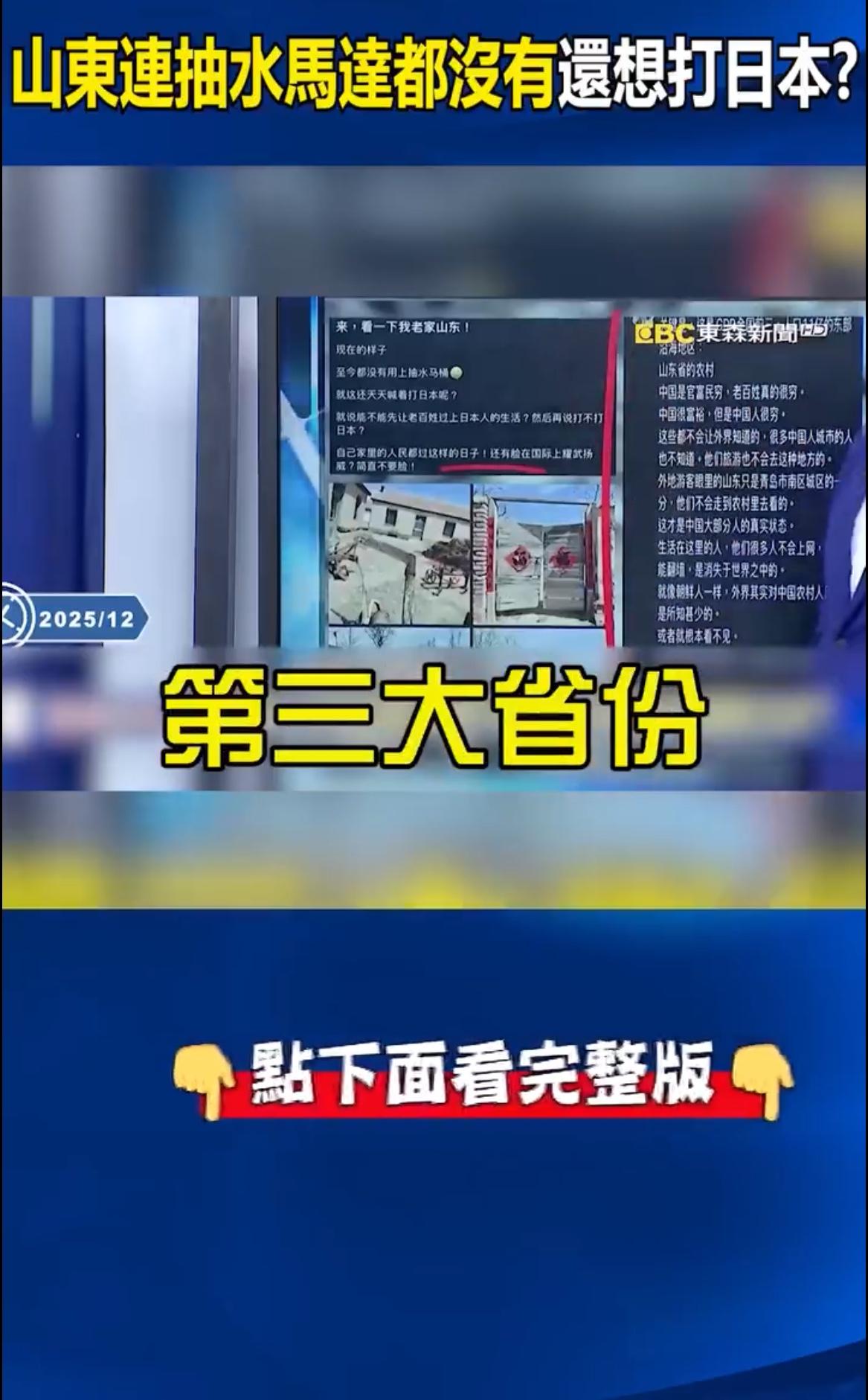 台湾电视节目主持人表示:中国大陆不要整天想着打日本了,山东作为中国大陆GDP第三大的省份,却连抽水马桶都没有,大陆改革开放前的农村有近八亿人口,生活状态都还是这么落后,没有抽水马桶,还整天喊说要打日本,要不要先让老百姓过上日本人的生活?” 日本老百姓的生活是什么,物价上涨,生活成本上升,缺米、米价贵,蔬菜水果样样贵?!