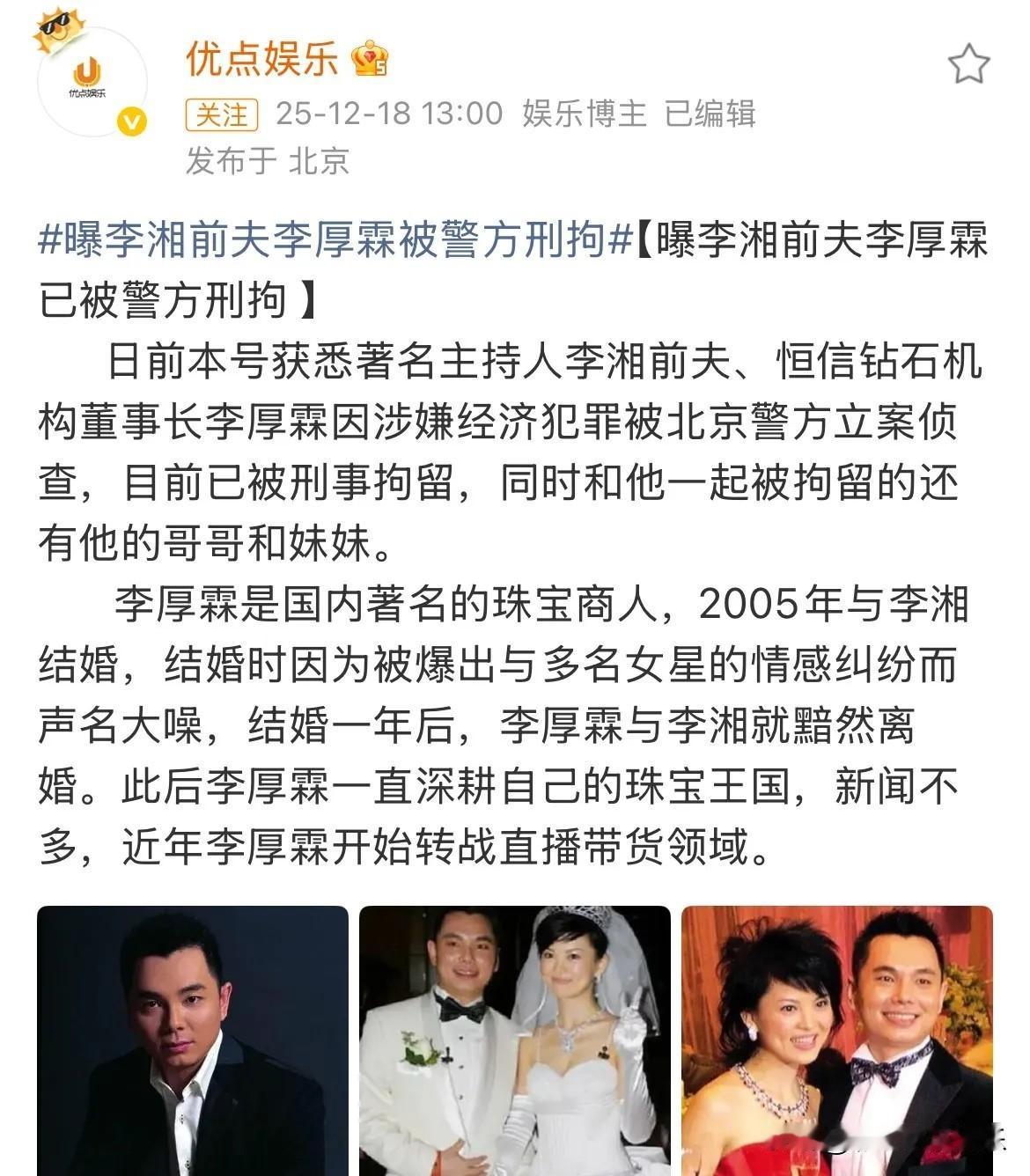 李湘前前夫李厚霖被刑拘,他的哥哥妹妹也被拘留了,是经济罪很复杂。 李湘和他闪婚一年就离婚了,还好跑得快不然就要一起承担被拖累,离婚的时候李厚霖已经破产了。 李湘的眼光毒辣,知道自己和他不是一路人,发现不对劲立刻跑路,还被说现实。 换做任何女人都是跑路,毕竟对方的营业方式她不认同,早晚要出事,现在好了终于东窗事发,刑拘坐牢还要牵连子女考公,所以还是李湘聪明。