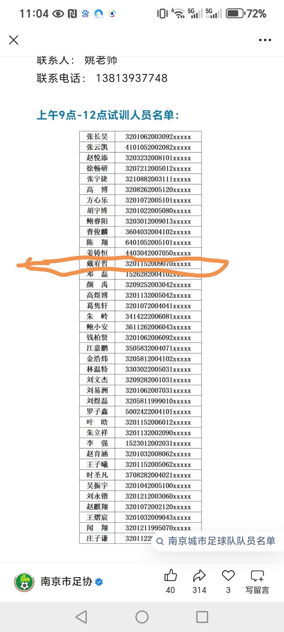 昨天晚上,南京市足协发的公告,清清楚楚的列出了苏超南京队星期六的试训名单!在上午的名单里,戴宥哲榜上有名。这群活在孤岛上的教徒基本跟瞎子没区别,我截的就是南京市足协公告号的名单,他们眼瞎看不见,就说戴宥哲在名单里是我瞎编的教徒们,南京市足协公众号链接给你们准备好了。网页链接去找找你们的心头肉吧中国足球小将中超联赛热点解读 网页链接