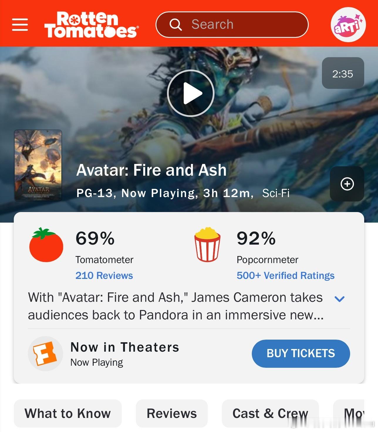 《阿凡达:火与烬》烂番茄上观众打分的爆米花指数开分92%,与第二部一样