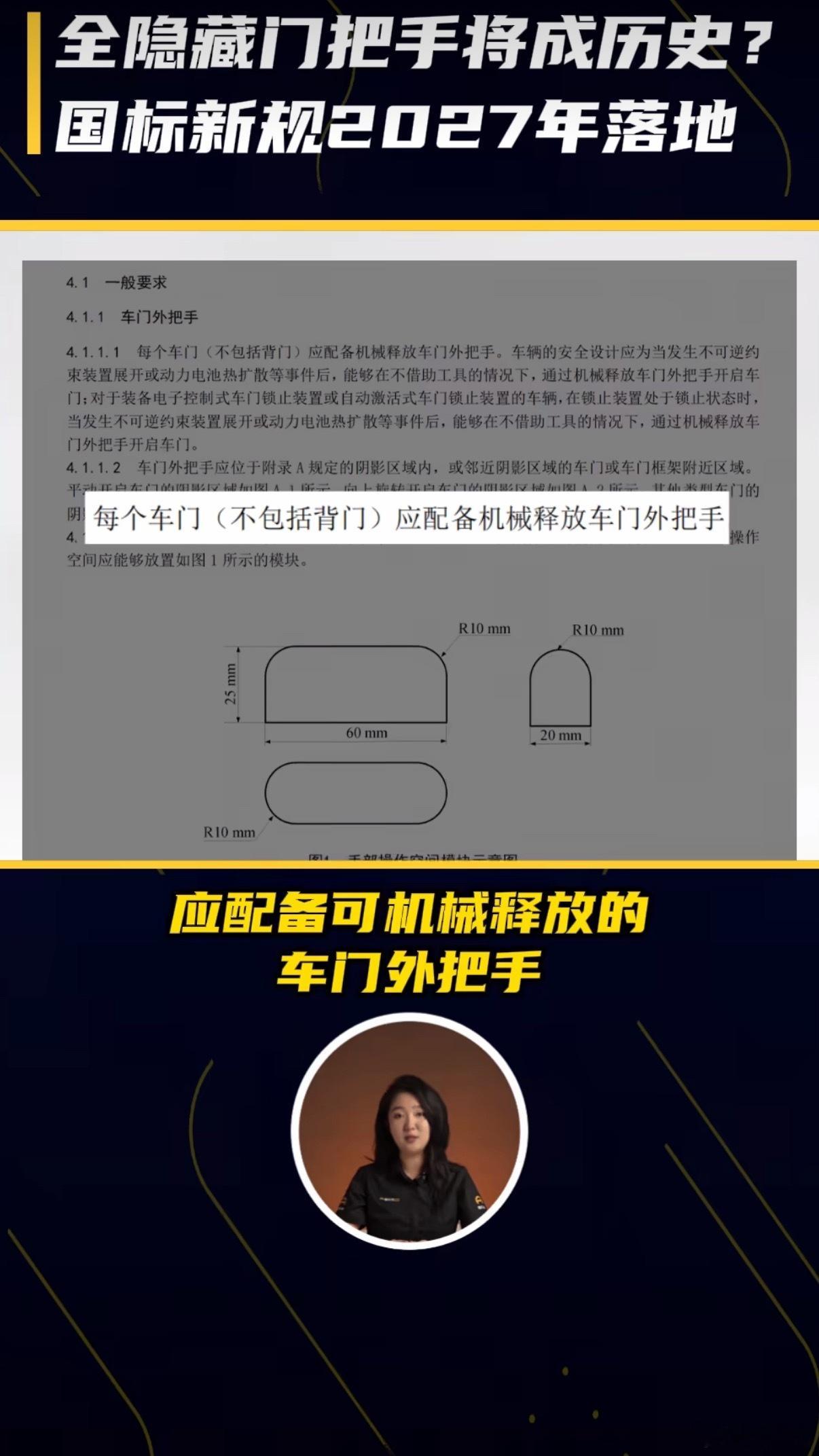 明确禁止全隐藏式门把手挺好的,像我们比较了解新能源车还知道怎么开门。一般人打车遇