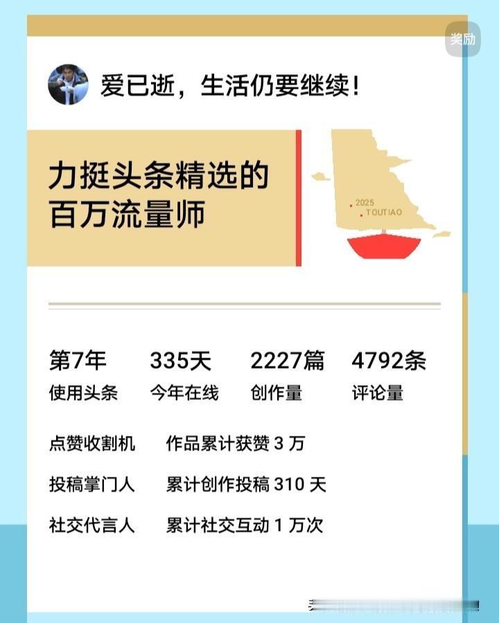 我现在被头条评为了“百万流量师了称号。以下是我从喜欢上今日头条开始,直到2019年开始参与头条创作到2025年,一共2232天所有的战绩。最高一篇作品是一个视频,是关于缅甸发生7.9级大地震的。获展现量1400多万和585万阅读量!一起欣赏一下吧!
