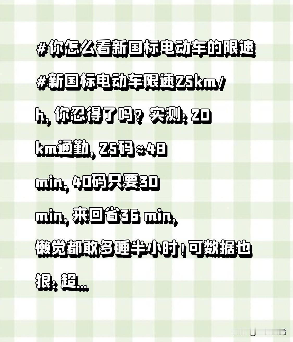 新国标电动车限速25km/h,你忍得了吗? 实测:20 km通勤,25码≈48 min,40码只要30 min,来回省36 min,懒觉都敢多睡半小时! 可数据也狠:超25码,碰撞死亡率从10%飙到30%+,刹车距离多2米,真撞上就秒懂“慢”才是保命符。 想快?电摩证+保险+牌照,一条龙安排,50码随便跑。 要我说:10 km内接娃买菜,25码够用;跨城通勤,别为难小电驴,地铁+电摩更香。 安全 or 效率,你站哪边?评论区见!