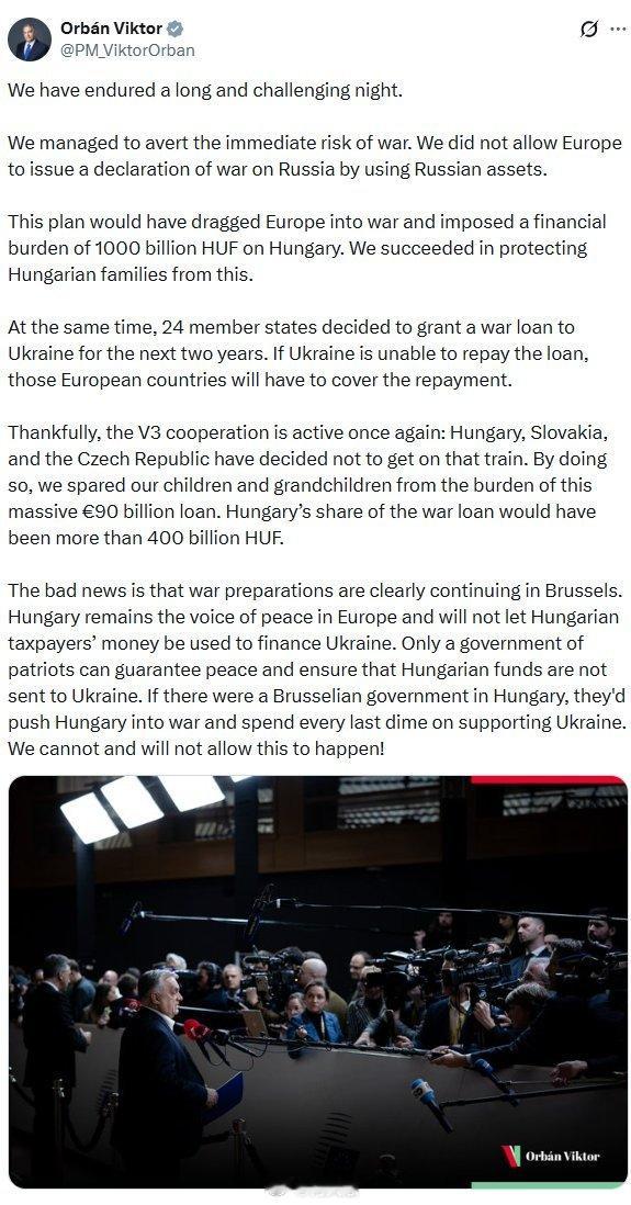 奥尔班解释了布鲁塞尔刚刚发生的事情:24 个成员国“决定向乌克兰提供为期两年的战争贷款。如果乌克兰无法偿还这笔贷款,那么这些欧洲国家将不得不承担还款责任。” “一个非常不幸的消息是,布鲁塞尔方面显然仍在进行战争准备工作。”——欧尔班海外新鲜事何天恩