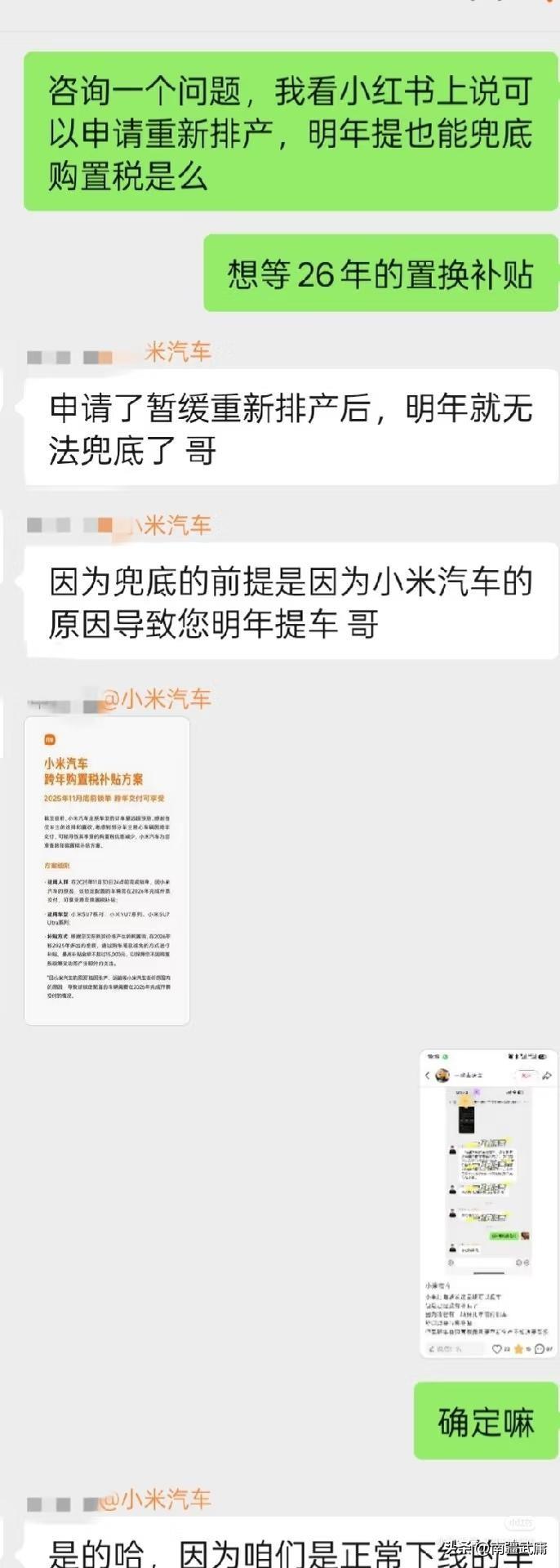 主动暂缓排产就没补贴?小米汽车购置税兜底规则藏“猫腻” 近日,小米汽车准车主曝光与客服的沟通截图,其购置税兜底规则的限制条件引发热议。 客服明确,购置税兜底仅针对小米汽车自身原因导致2026年提车的情况;若车主主动申请暂缓重新排产,明年提车将直接失去该福利。不过车辆正常下线后,官方可额外保留订单30天,此期间提车仍能享受购置税兜底,而2026年国家置换补贴需以明年政策为准。 此外,车主询问购置税差额是否通过尾款减免补贴,客服回应将进一步核实。这一规则让想等2026年置换补贴的准车主陷入选择两难,也引发了对车企补贴政策设置合理性的讨论。