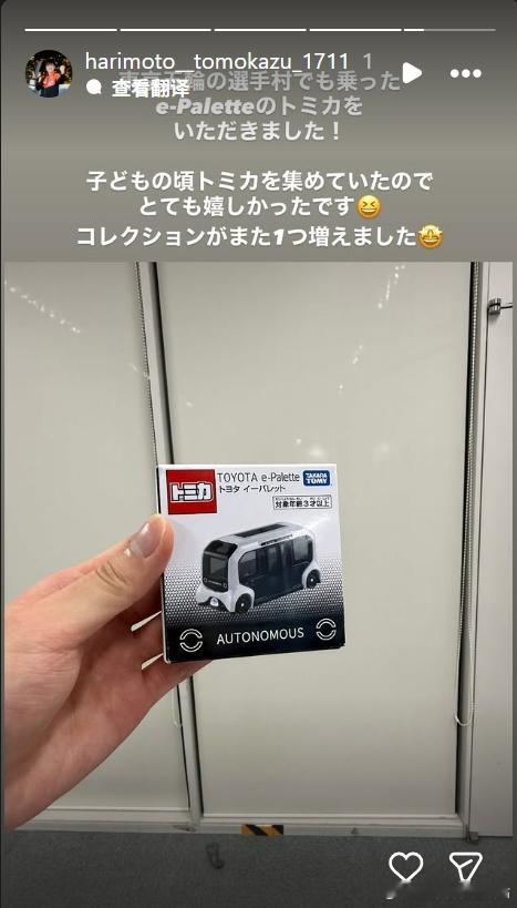 张本智和 251219 张本智和ins快拍P1:“我在近日于总部,向丰田的相关人士进行了年末问候,并汇报了获得 WT 总决赛冠军的消息!大家都非常热情地欢迎我,能够回到这里,让我由衷地感到安心与温暖的情绪涌上心头。大家通过电视和直播为我加油支持,也收到了许多祝贺与鼓励的话语,真的非常感谢大家!明年的亚洲运动会中,乒乓球项目将在丰田市举行。为了能够和大家一起夺得金牌,今后我也将作为丰田的一员继续努力拼搏!”P2:还来了一场迷你的乒乓球对决。P4:我收到了 e-Palette (丰田制造的无人驾驶电动车)的多美卡模型——这种 e-Palette 我当时在东京奥运会选手村里也乘坐过!因为小时候就有收集多美卡,真的非常开心😆收藏又增加了一件🤩(以上机翻。)········注:多美卡(Tomica)是日本玩具公司多美(TAKARA TOMY)于1970年推出的合金汽车模型品牌。其车型通常采用约1:64比例,以结实耐用、还原度高著称,深受儿童和成人收藏者喜爱。多美卡的产品涵盖家用车、公交车、工程车辆、警车、消防车以及新干线等多种类型,几乎囊括了现实生活中的各种交通工具。在日本,多美卡被视为许多人的童年回忆,不少人从小开始收集,成年后仍持续关注。除常规系列外,多美卡还推出了高级收藏向的 Tomica Premium 系列,以及与汽车厂商、赛事、纪念活动合作的限定款。例如奥运会、企业概念车或特殊交通工具版本,都具有较高纪念意义。