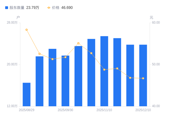 日期A股户数(户)流通A股户均持股数(股)户均持股市值(万元)2025-11-282378784461.2020.882025-11-202503934238.2220.792025-11-102542424174.0620.362025-10-312489274263.1822.472025-10-202352324511.3824.852025-09-302170594889.0925.302025-09-192299634614.7523.662025-09-102156014922.1525.872025-08-291650406430.0837.502025-08-201695536258.9328.63