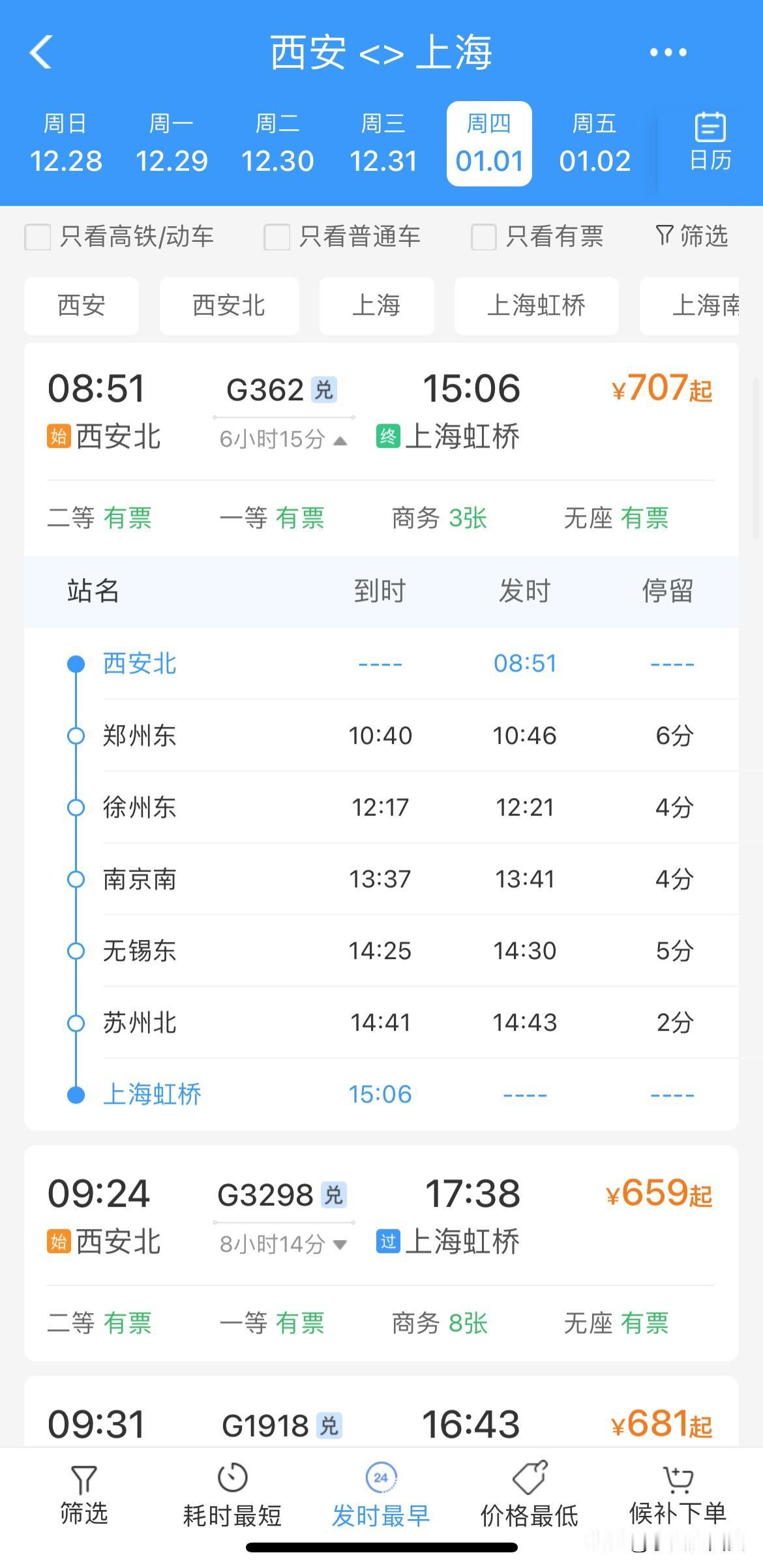 西安北到上海虹桥的标杆高铁G362次列车 G362次列车每天上午8时51分由 西安北站出发,运行线路郑西高铁🚄 京沪高铁,沿途经停郑州东、 徐州东、南京南、无锡东、苏州北, 下午15时06分抵达终点站 上海虹桥站,全程运行 时间6小时15分钟。 是目前西安到上海之间运行时间 最短的高铁列车。 坐着高铁看中国 冬日生活打卡季