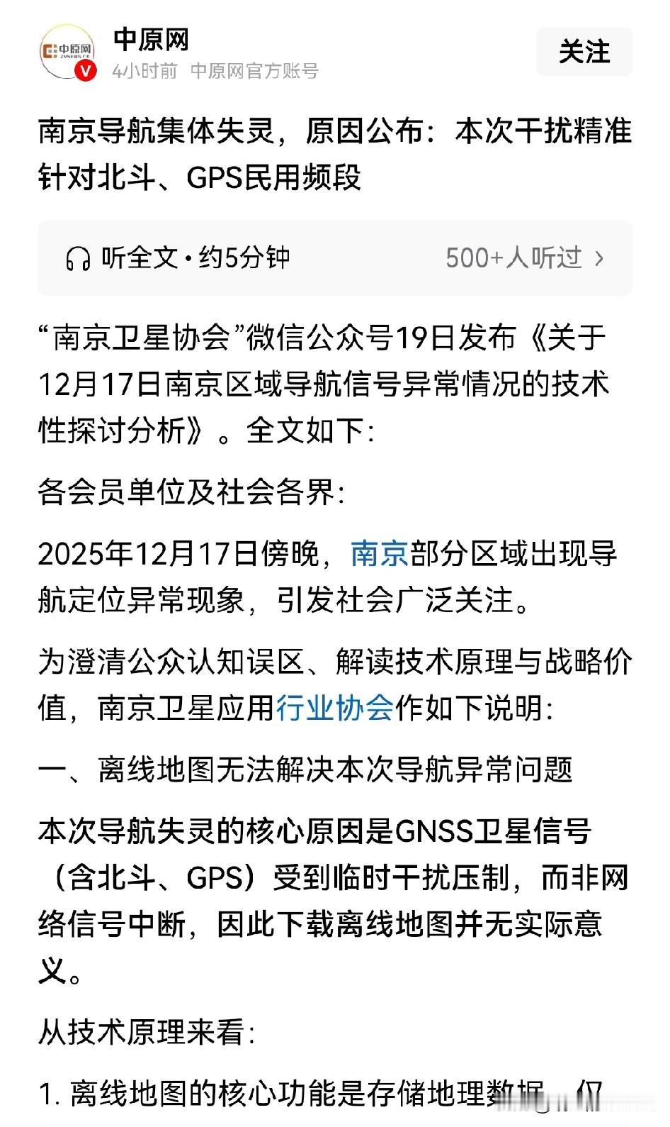 导航失灵系卫星信号受精准干扰…从专业解读上看,有两个重点: 1、北斗卫星定位系统军用信号抗干扰能力强,未受影响。 2、体现了民用频段北斗与GPS深度捆绑的先见之明,既干扰北斗同时GPS也会受影响。 话都已经说的很明白了! 朋友们,你们对此事怎么看? 欢迎大家在评论区探讨,留言…[送心]