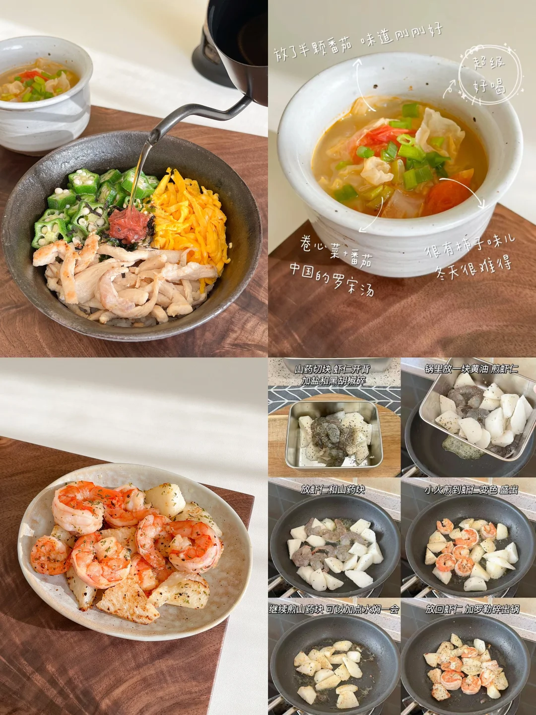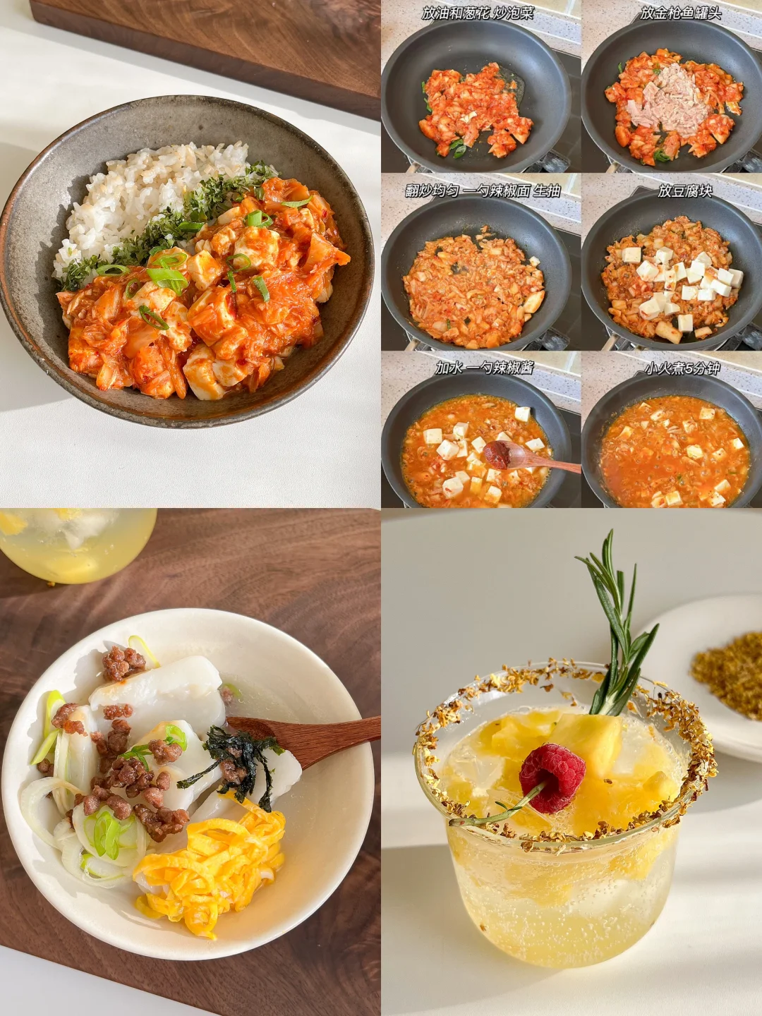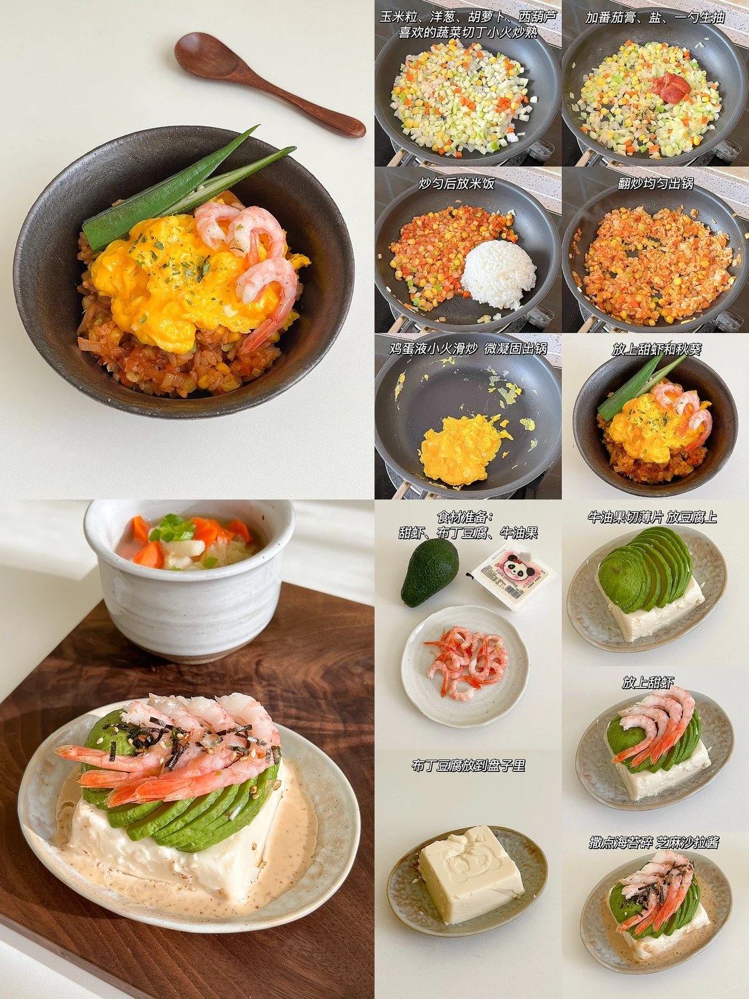 “就算一个人吃饭,也别亏待了自己!” 整理了一下最近比较喜欢的午餐 都是简单又好做的 营养健康 做法在图上 🟠泡菜金枪鱼豆腐拌饭+年糕汤+菠萝气泡水 🟡滑蛋甜虾番茄炒饭+牛油果豆腐+白菜味增汤 🔴烤肉饭+土豆蘑菇煎虾仁+橘子红茶 🟢三色茶泡饭+黄油煎山药虾仁+番茄卷心菜汤