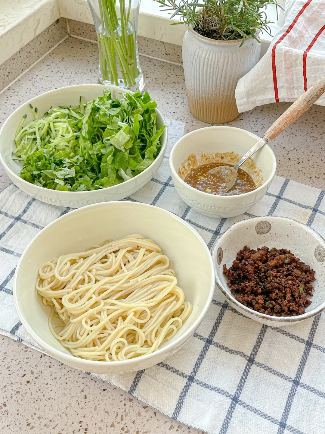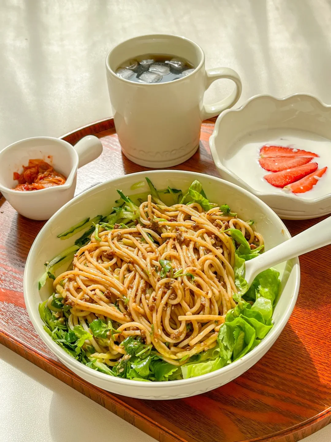 今天做一碗春天清爽绿绿的牛肉麻酱拌面 天气开始慢慢热了 可以开始做各种凉拌面 不知道吃什么的时候 就来一碗 万能麻酱口味真是拌啥都好吃! 减脂期可以换成荞麦面或者增加蔬菜量 做法炒鸡简单 5分钟就能轻松搞定 今天收到了新买的餐具 是我最喜欢的松露白 手感很细腻 而且超级厚实 拿在手里很有分量 我是很喜欢买餐具和厨具 小小的东西很治愈 等有空可以出一期餐具分享~ 🧾食材: 🥬生菜|🥒黄瓜|🥗香菜 🍓草莓|🥛酸奶|🌶辣白菜