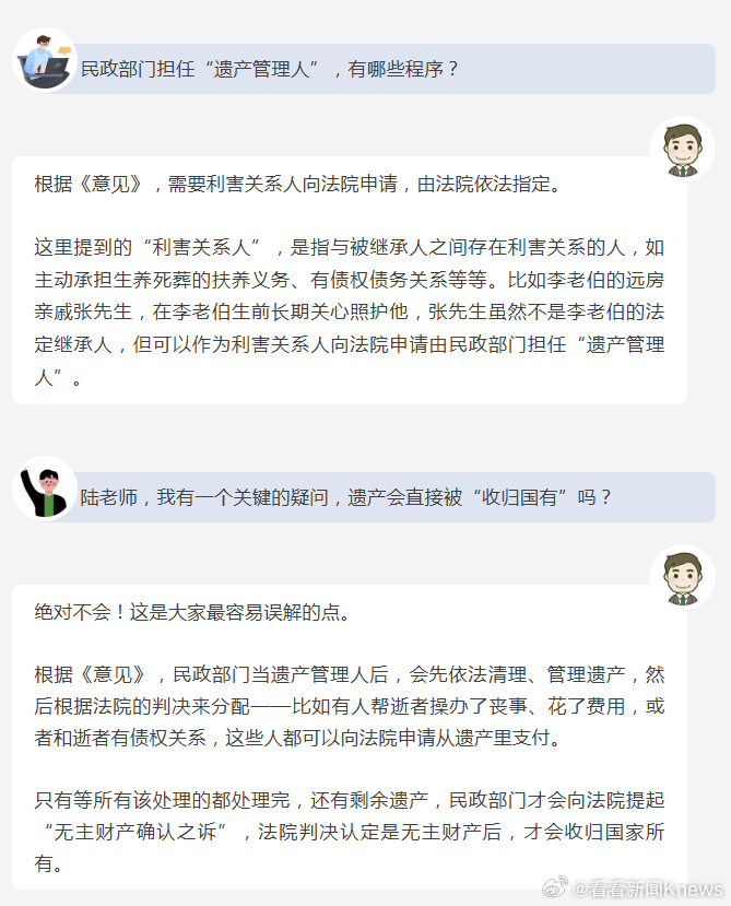 【#民政回应无继承人遗产后事谁来管#】#遗产不会直接被收归国有# 如没有配偶、子女,父母早已去世,也没继承人,留下的房产和存款该怎么处理?身后的丧事又该谁来操办?万一身边没人能帮忙处理身后事,遗产会不会没人管?民政部门能出面吗?12月19日“上海民政”微信公号发文解释。一、什么是“遗产管理人”?谁能当?“遗产管理人”是《民法典》明确的制度,核心就是确保遗产的合理分配和有效管理,避免纠纷,保护继承人等的合法权益。根据《民法典》的规定,继承开始后,遗嘱执行人为遗产管理人;没有遗嘱执行人的,继承人应当及时推选遗产管理人;继承人未推选的,由继承人共同担任遗产管理人;没有继承人或者继承人均放弃继承的,由被继承人生前住所地的民政部门或者村民委员会担任遗产管理人。比如李老伯是一名户籍在本市某街道的孤老,不幸离世,没有继承人,他生前住所地的区民政局依照法院判决,可以担任遗产管理人。这里特别说明的是,根据《民法典》规定,居委会不能担任遗产管理人,村民委员会可以担任。根据2024年出台的《上海市人民政府办公厅关于民政部门履行遗产管理人职责以及处置无人继承遗产的若干意见》(以下简称《意见》),民政部门担任遗产管理人后,职责主要包括清理遗产并制作遗产清单、采取必要措施防止遗产毁损和灭失、处理被继承人的债权债务、根据法院判决分配和处置遗产等等。二、民政部门担任“遗产管理人”,有哪些程序?根据《意见》,需要利害关系人向法院申请,由法院依法指定。这里提到的“利害关系人”,是指与被继承人之间存在利害关系的人,如主动承担生养死葬的扶养义务、有债权债务关系等等。比如李老伯的远房亲戚张先生,在李老伯生前长期关心照护他,张先生虽然不是李老伯的法定继承人,但可以作为利害关系人向法院申请由民政部门担任“遗产管理人”。三、遗产会直接被“收归国有”吗?绝对不会!这是大家最容易误解的点。根据《意见》,民政部门当遗产管理人后,会先依法清理、管理遗产,然后根据法院的判决来分配——比如有人帮逝者操办了丧事、花了费用,或者和逝者有债权关系,这些人都可以向法院申请从遗产里支付。只有等所有该处理的都处理完,还有剩余遗产,民政部门才会向法院提起“无主财产确认之诉”,法院判决认定是无主财产后,才会收归国家所有。四、如果逝者没有近亲属,他的丧事谁来操办呢?上海有无明确规定?这方面本市已有明确规定。根据《上海市殡葬管理条例》第十七条:死者的近亲属或者愿意承办丧事的其他亲属是丧事承办人;死者没有亲属的,其生前单位或者临终居住地的居(村)民委员会是丧事承办人。死者生前约定丧事承办人的,从其约定。据此规定,比如像上面提到的李老伯,如果他的远房亲戚张先生愿意承担丧事,可以作为丧事承办人。如果张先生不愿意担任,李老伯生前所在的单位或者所居住的居(村)委会应该作为他的丧事承办人。五、民政部门经法定程序担任“遗产管理人”后,能够购买墓地吗?民政部门不能直接处置遗产用于购买墓地。但是,关于遗产的分配,相关利害关系人有适当理由要求参与遗产分配的,可以向人民法院提起诉讼。法院支持利害关系人诉请的,民政部门应根据法院判决或裁定执行。还是以李老伯为例,尽管法院已经判定区民政局是他的遗产管理人,但根据规定,民政部门不能直接处置遗产用于购买墓地。如果丧事承办人为其购买了墓地,支付了相关合理费用,可以向法院申请主张该费用,如果法院支持,民政部门就会按判决执行,从遗产中划钱。六、什么是“意定监护”?《民法典》第三十三条说得很清楚:具有完全民事行为能力的成年人,可以与其近亲属、其他愿意担任监护人的个人或者组织事先协商,以书面形式确定自己的监护人,在自己丧失或者部分丧失民事行为能力时,由该监护人履行监护职责。仍以李老伯为例,只要李老伯是完全民事行为能力人,就可以提前和自己信任的人,或者专业的组织商量好,用书面形式确定对方当李老伯的监护人。等以后李老伯丧失或者部分丧失民事行为能力(比如生病昏迷、年纪大了失智),这个监护人就会帮助做这些事:生活照料(比如请护工、安排住处);财产管理(比如管存款、收房租);医疗决定(比如手术签字);处理身后事(比如办丧事、买墓地、分配遗产)。离世无继承人,遗产和后事谁来管?上海民政发文回应