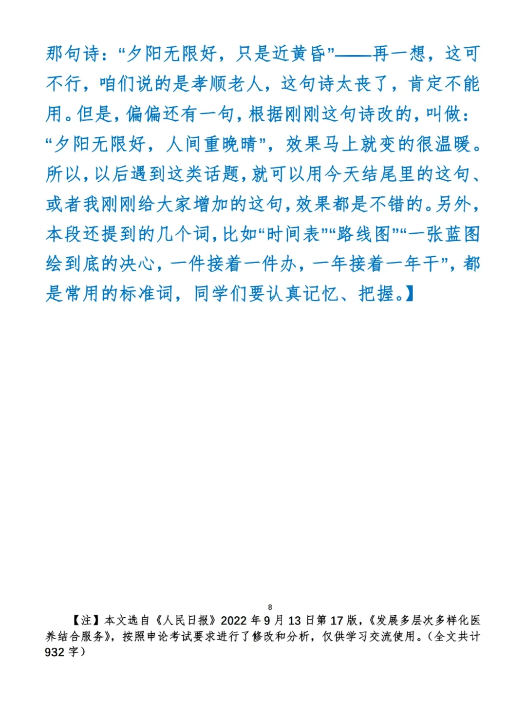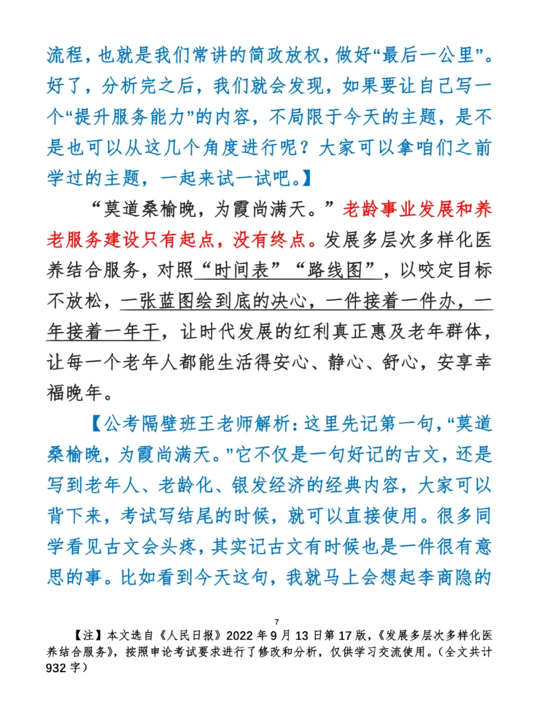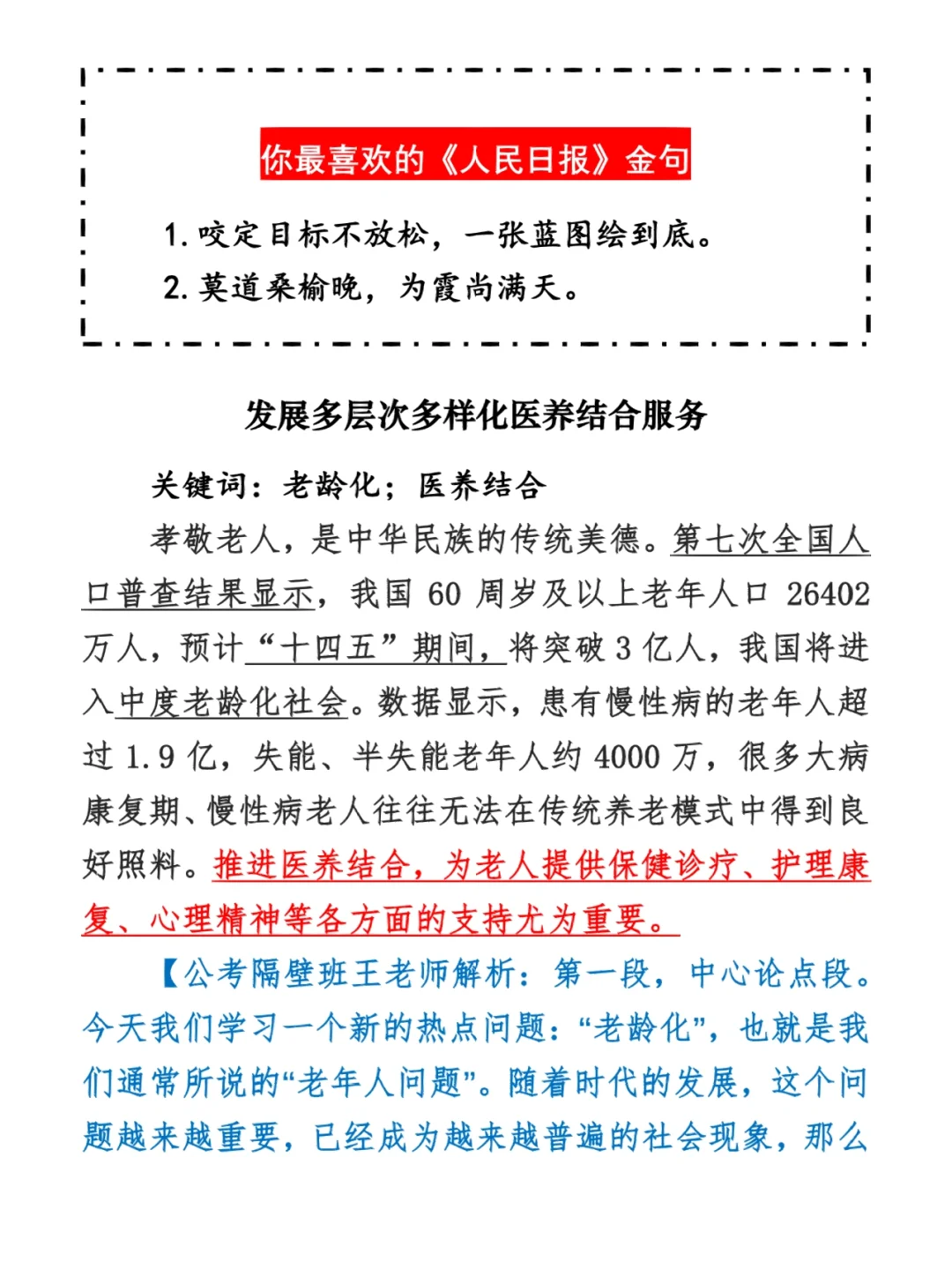 今日打卡作业: 1. 选一句你最喜欢的金句 2. 抄写全文红字+划线部分内容 3. 写完后在留言区打卡 ⭐️ ⭐️ ⭐️ ⭐️ ⭐️ ⭐️ 如何抄写:每天的抄写文章以图片形式发在“公考隔壁班王老师”账号,红色字是重点句和结构句,黑色字是正文,蓝色字是解析,大家抄写时不必抄蓝色字。建议先通读全文(包括蓝色解析部分),做到心中有数再开始抄写,效果会更好。 关于文章:抄写文章来源于人民日报,但每篇文章我都根据申论考试要求进行了修改,主要集中在四个方面:一是重写或修改开头、结尾;二是统一段首句句式结构;三是调整段落字数,使文章结构更均衡;四是简化复杂长难句,使之更具可模仿性。每篇文章修改幅度不同,无论修改多少,都是基于申论考试要求,毫无对人民日报文章品评之意。(此处致敬人民日报) 关于解析:我会在文章每段后面加一段蓝色字的解析,是我自己在抄写时的感悟,篇幅时间有限,不能面面俱到,但求重点突出。如果你有其他感悟,也希望能在评论里分享,我们相互学习、共同进步。 ⭐️ ⭐️ ⭐️ ⭐️ ⭐️ ⭐️ 这里是公考隔壁班王老师独创的“每天半小时・申论80分”抄写团,欢迎加入我们!