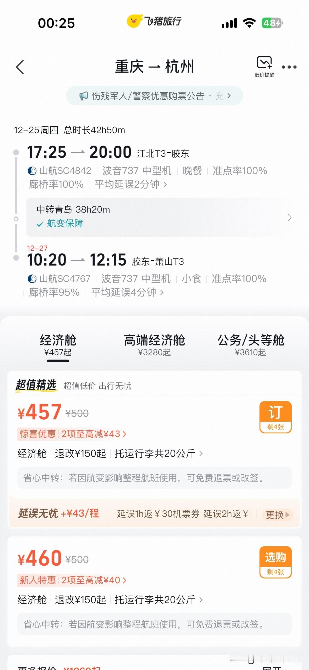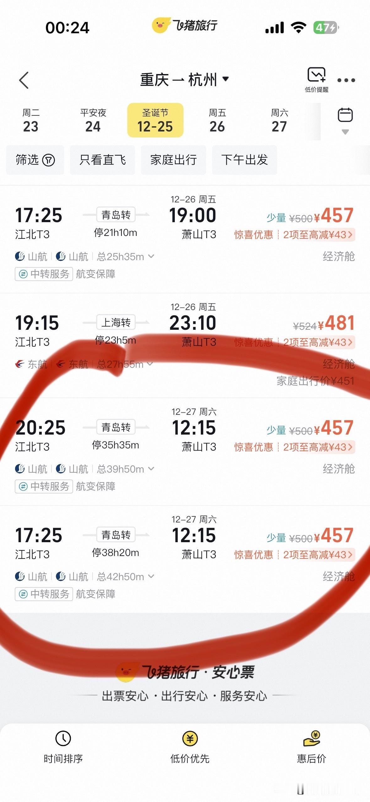 我的天,重庆人,可以去山东青岛免费玩2天,免费住一个晚上的酒店!怎么实现?!只需要花457块钱买一张重庆飞杭州的机票,选择青岛中转,即可免费玩青岛! 具体行程如下: 例如: 12月25日,星期四,下午5点25分,重庆江北机场起飞,晚上8点抵达青岛胶东机场…… 12月26日,星期五,从早到晚,都在青岛游玩…… 12月27日,星期六,上午10点20分,青岛机场起飞,中午12点15分抵达杭州…… 两次坐飞机,一共只要457块钱的机票……相当于白去青岛玩2天! 就问你,香不香?!