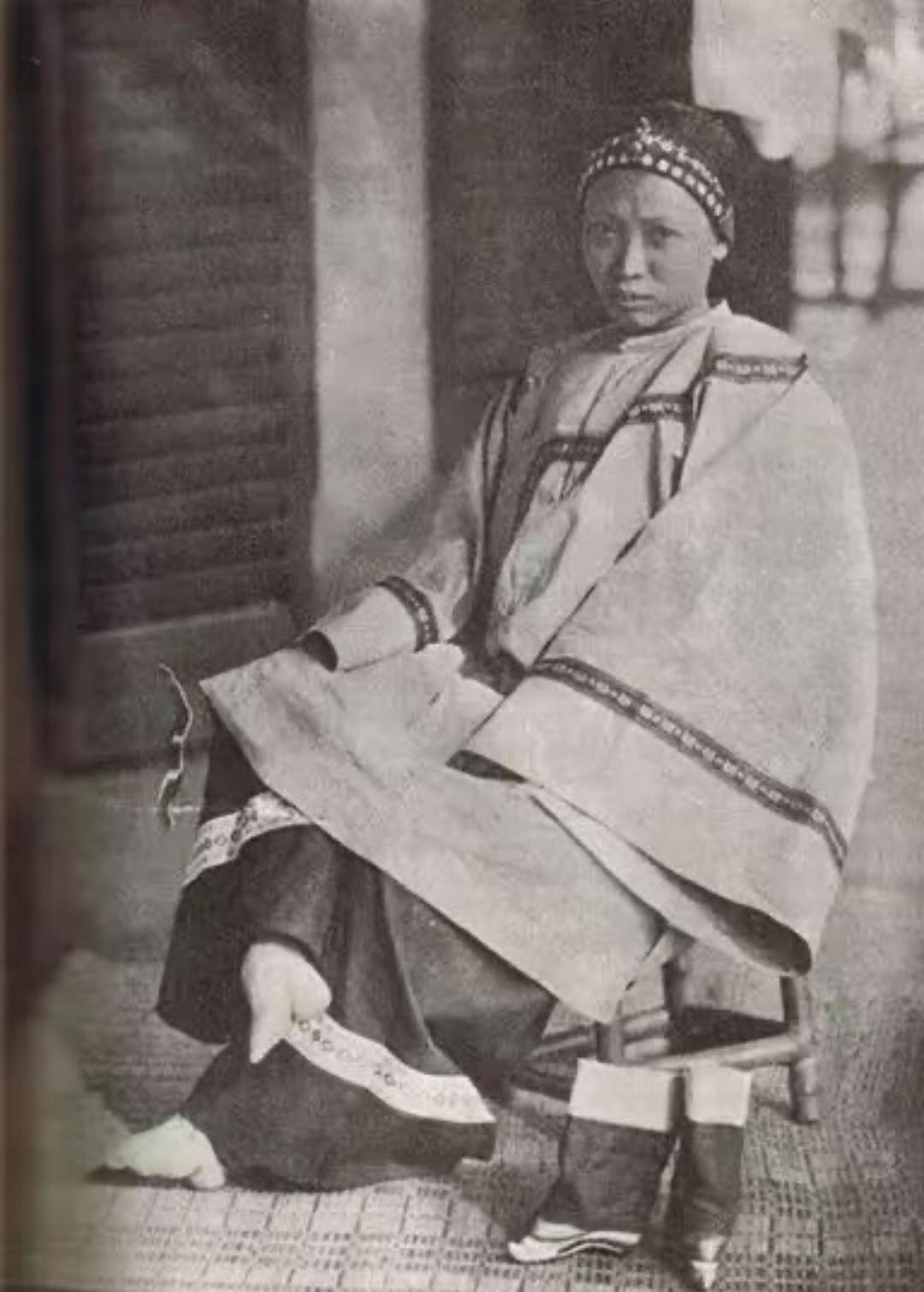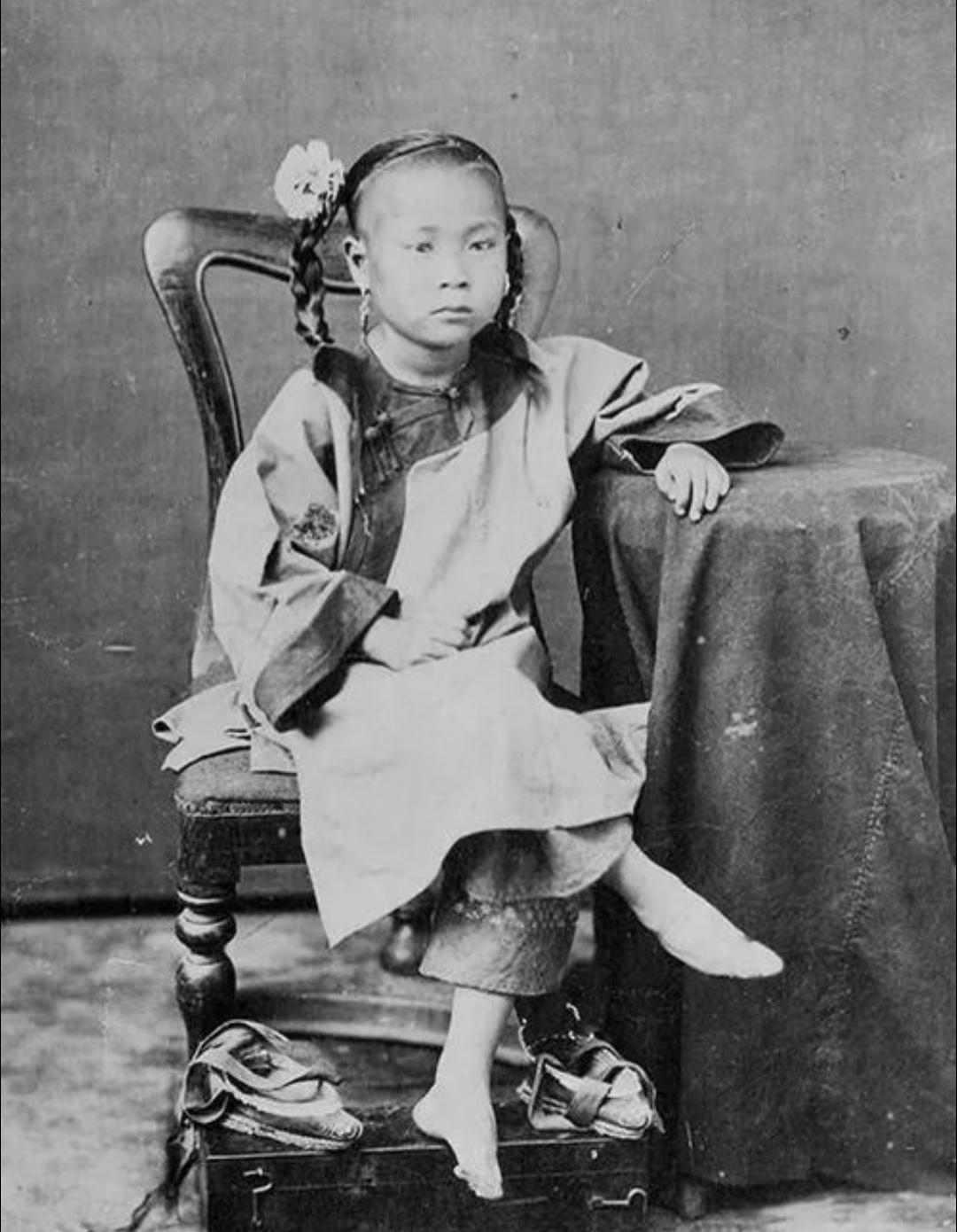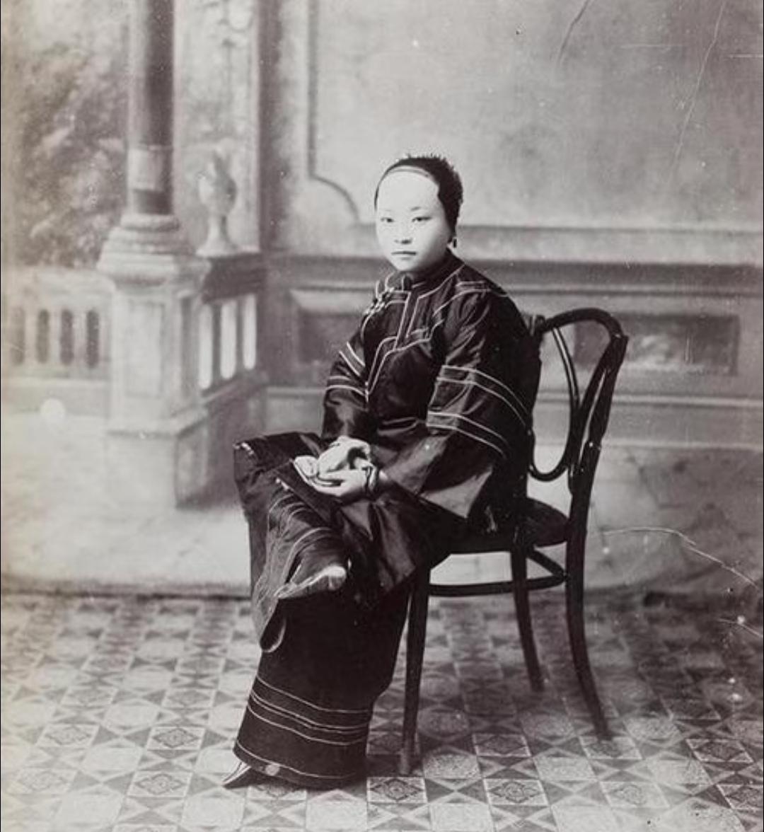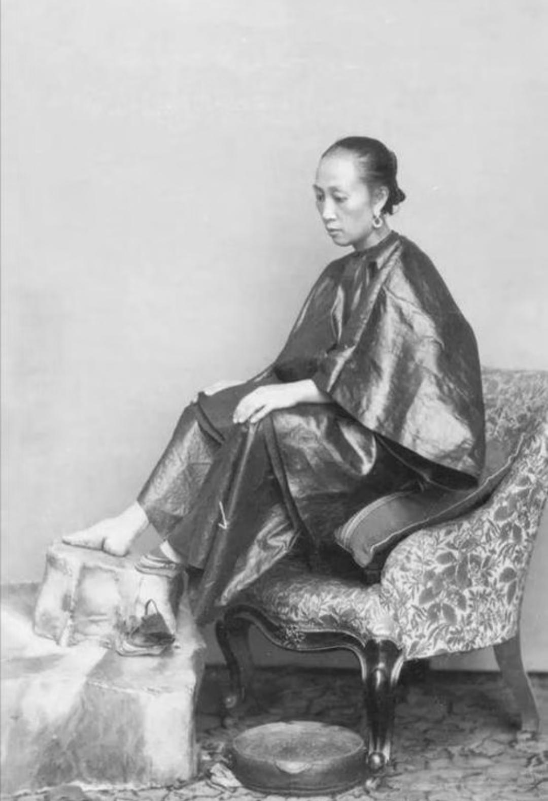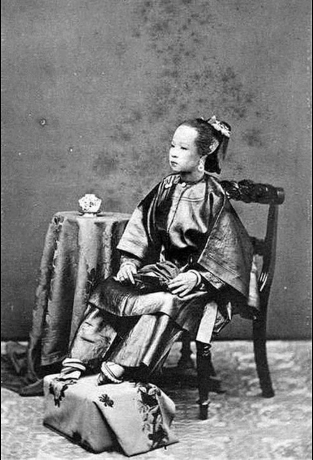 晚清旧照 三寸金莲 。缠足(裹足、裹脚)是中国古代的一种陋习,就是把女子的双脚用布帛缠裹起来,使其成为又尖又小的“三寸金莲”。