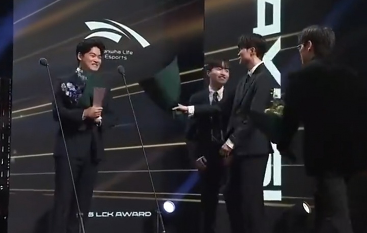 直播吧12月20日讯Gumayusi在昨晚的LCK颁奖典礼中,获得“LCK年度ADC选手”奖项;Guma的前T1队友上台送上鲜花。