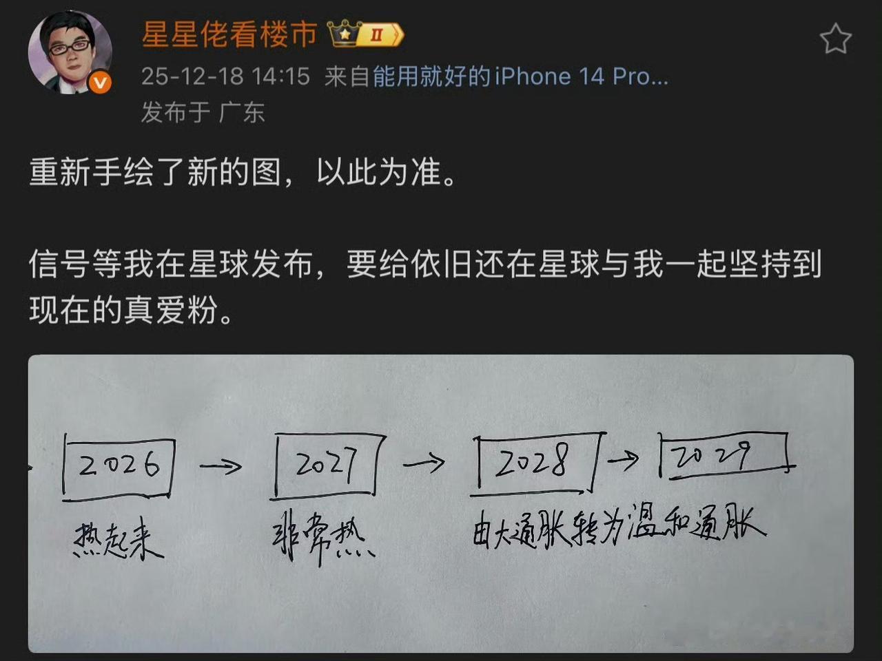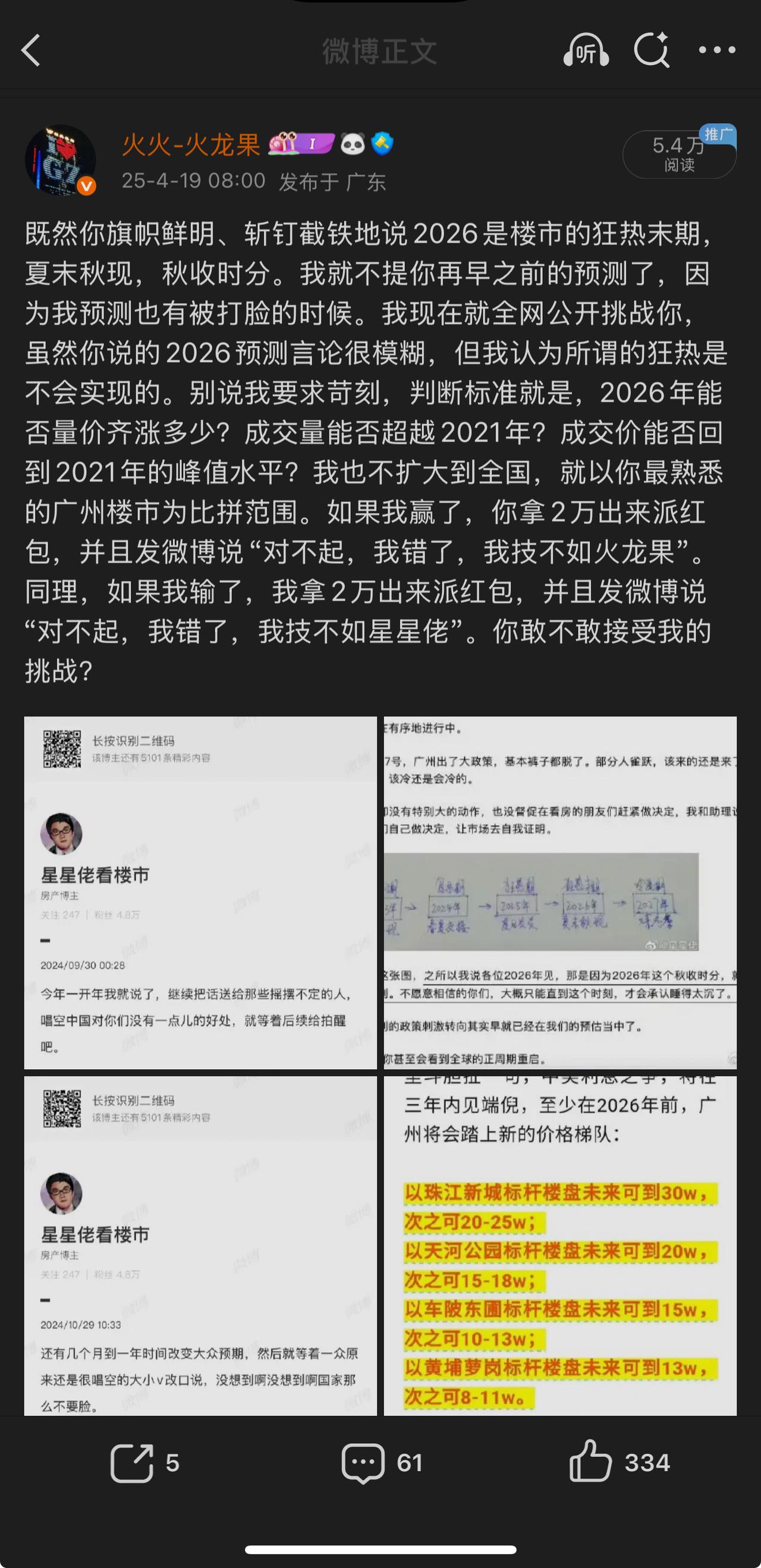 [笑哭]由始至终,星星佬都没敢接受我的挑战,而且我对它的楼市观点、房产思维、市场分析、走势预测等提出的所有异议,它也没反驳。反而频繁用低俗的语言骂人。虽然星星佬一再推迟房价暴涨的时间,但我继续发起挑战。 既然你旗帜鲜明、斩钉截铁地说2026热起来,2027非常热。我现在就再次全网公开挑战你。我认为你提出的“热起来和非常热”是不会实现的。咋们先说说2026年吧,因为假如2026都热不起来,就不要说后面的2027了。所谓“量在价先”,判断标准如下: 第一,既然你说2026会热起来,而且整体房价指数已经回到2016,那么就索性参考十年前广州楼市普涨的数据。假设2026年广州一二手房的成交量能达到2016年的90%,都算“热起来”。 第二,如果你不接受第一点,那我再降低难度。假设2026年广州一二手房的成交量能超越2021年,也算“热起来”。 第三,2026年的成交价能回到2021-2023年期间峰值水平的90%,也算“热起来”。 以上三点,任选其一,或者全选都行。 如果我赢了,你拿10万出来派红包,并且发微博说“对不起,我错了,我技不如火龙果”。同理,如果我输了,我拿10万出来派红包,并且发微博说“对不起,我错了,我技不如星星佬”。你敢不敢接受我的挑战?@星星佬看楼市