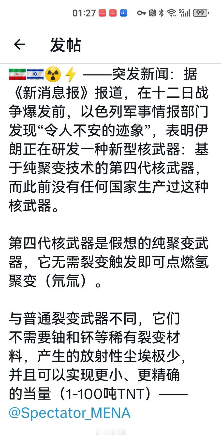 突发新闻:据《新消息报》报道,在十二日战争爆发前,以色列军事情报部门发现“令人不安的迹象”——表明伊朗正在研发一种新型核武器:基于纯聚变技术的第四代核武器,而此前没有任何国家生产过这种核武器。第四代核武器是假想的纯聚变武器,它无需裂变触发即可点燃氢聚变(氘氚)与普通裂变武器不同,它们不需要铀和钚等稀有裂变材料,产生的放射性尘埃极少,并且可以实现更小、更精确的当量(1-100吨TNT)海外新鲜事何天恩