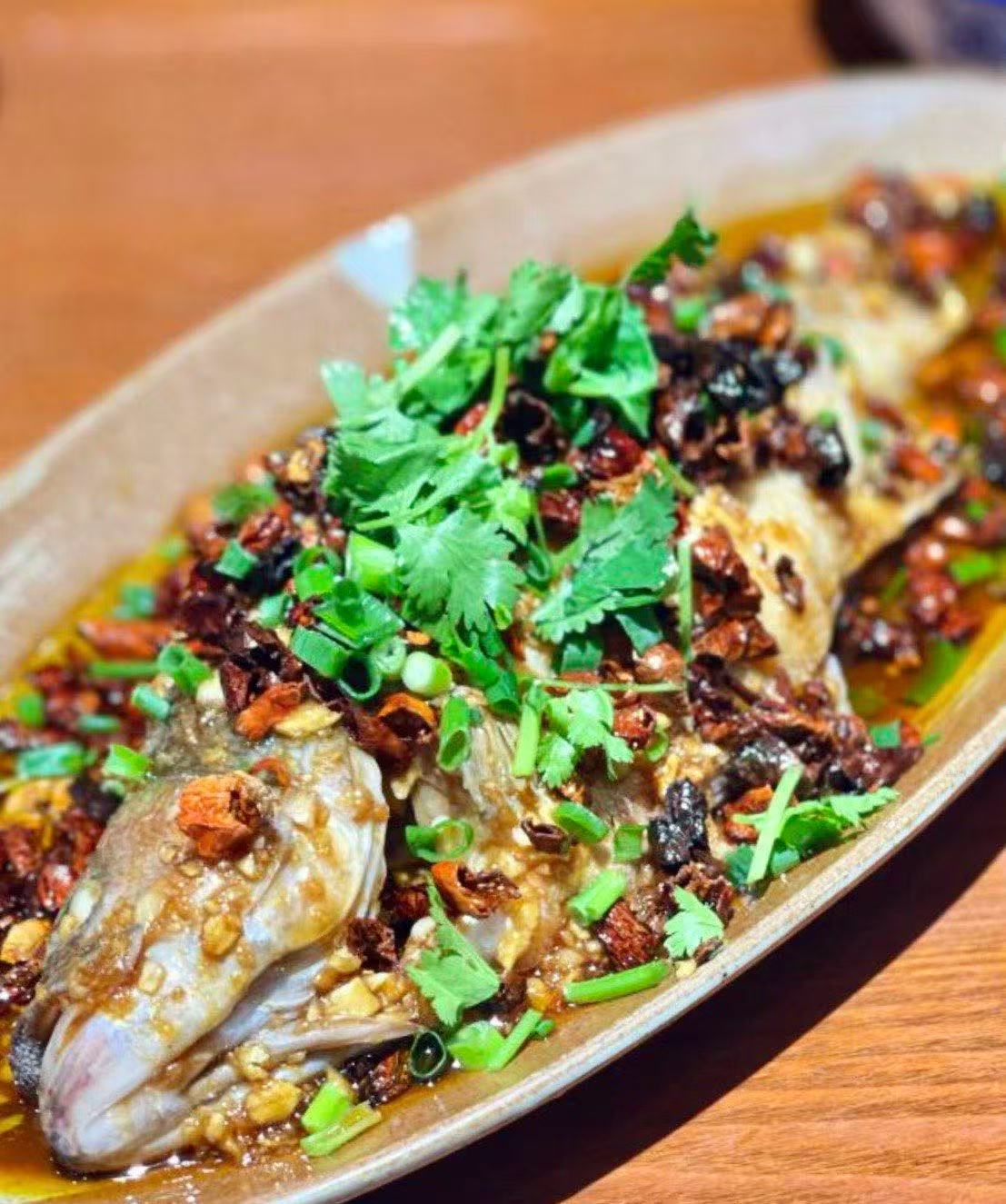 2️⃣.蒜香鲈鱼,鱼被整条烹饪,丝滑浇汁裹着嫩鱼肉,蒜香混合鲜甜。
