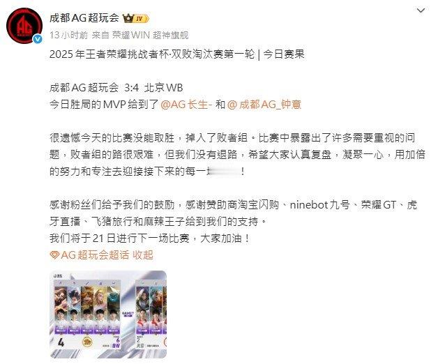 WB终结了AG在BO7的二十三连胜,其中暖阳拿下了四连MVP,只能说WB等这场胜利真的等了太久了!赛后发博,“很遗憾今天的比赛没能取胜,掉入了败者组。比赛中暴露出了许多需要重视的问题,败者组的路很艰难,但我们没有退路,希望大家认真复盘,凝聚一心,用加倍的努力和专注去迎接接下来的每一场挑战!WB战胜AGAG回应不敌WBAG掉入败者组