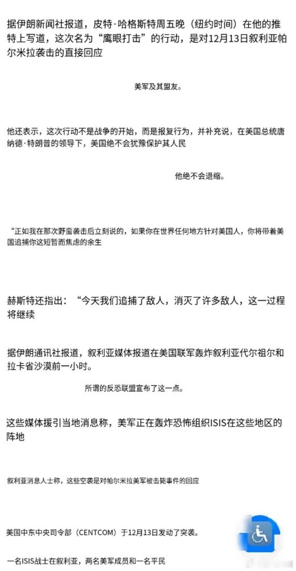 特朗普称美国正在报复据伊朗伊斯兰共和国通讯社(IRNA)报道,美国国防部长劳埃德·奥斯汀周五晚(纽约时间)在其社交平台“X”(原推特)账号上发文称:此次名为“鹰之眼打击”的行动,是对12月13日(伊朗历11月22日)叙利亚代尔祖尔省针对美军及其盟友袭击的直接回应。他还表示,此次行动并非战争的开端,而是一次报复性举措。他补充道:在唐纳德·特朗普(美国前总统)的领导下,美国永远不会在保护本国人民上有所迟疑或退缩。美国国防部长接着提醒道:正如我在那次袭击后立即所说,如果你们在世界任何地方将美国人作为目标,你们将在余生中惶惶不可终日,因为你们知道美国必将对你们进行追捕。奥斯汀还提醒道:今天,我们已经对敌人展开追捕,并消灭了他们中的许多人,这一行动还将继续。