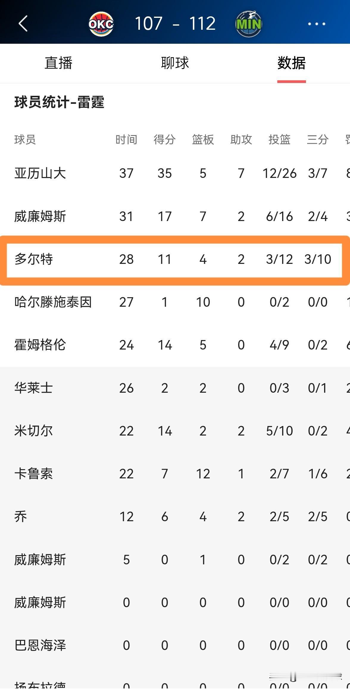我强烈建议雷霆大将多尔特不要浪投三分球了!在今天雷霆客场以107:112输给森林狼的比赛中,多尔特在三分手感不佳的情况下依然疯狂的出手了10次。 全场比赛下来,多尔特首发出战28分钟,投篮12中3,其中三分球10中3、罚球2中2得到11分,还有5次犯规,他的场上正负值为-7。 作为一名总冠军球员,多尔特在三分手感不佳的情况下应该更多的选择突破和传球才是上策,一味地出手三分会严重的伤害到球队的进攻。