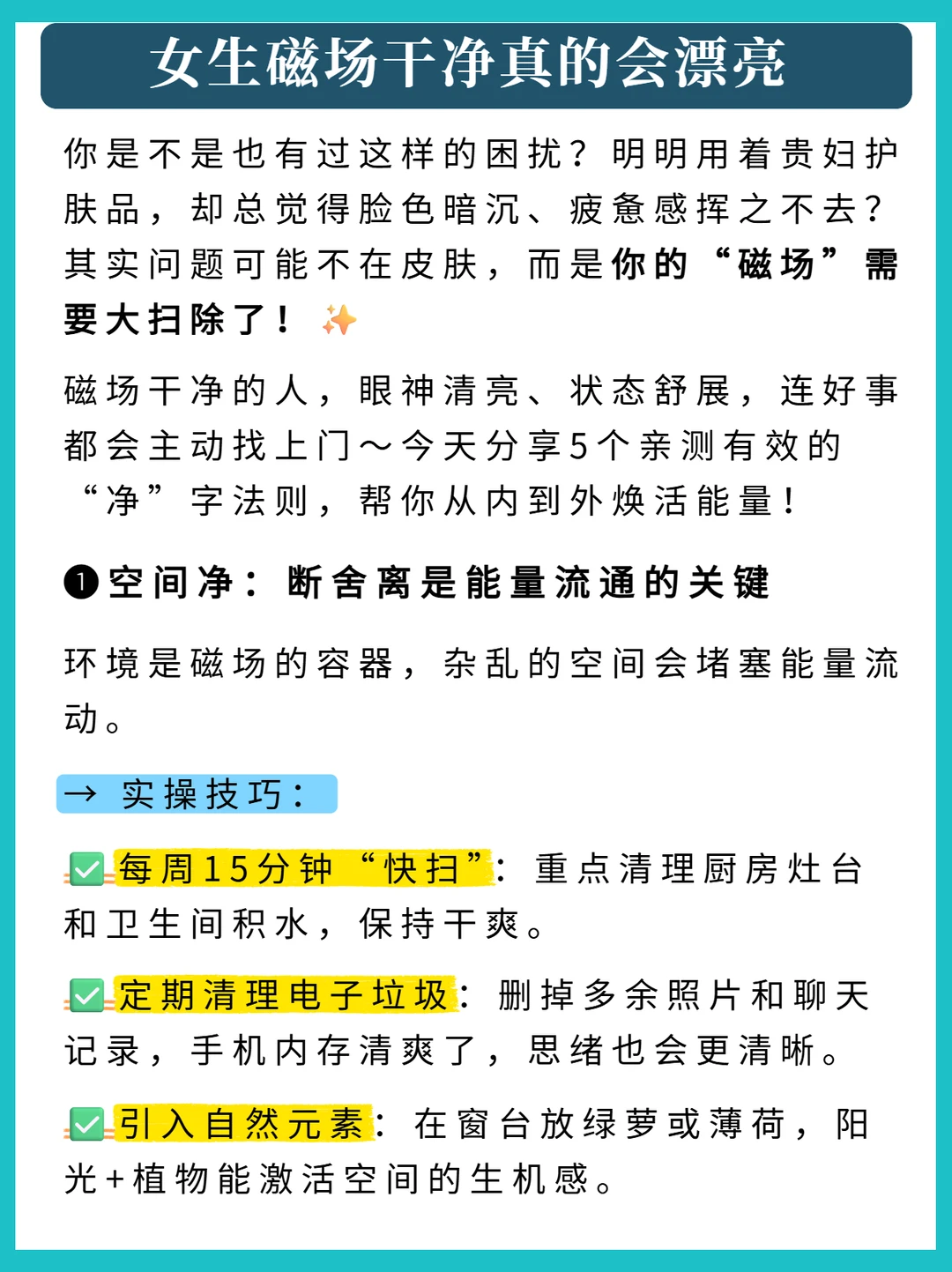 磁场干净的人,眼神清亮、状态舒展,连好事都会主动找上门~今天分享5个亲测有效的“净”字法则,帮你从内到外焕活能量!