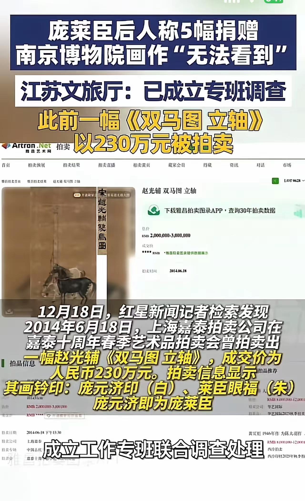 惊掉下巴!6800元“赝品”变8800万,南博这操作谁懂? 我真的被这事儿气到发抖!庞家当年无偿捐给南博137件宝贝,结果其中5幅被说是假的,上世纪90年代就给处置了。 最离谱的是仇英《江南春》,6800元就卖了,现在居然在北京拍卖估价8800万!还有带庞老爷子印章的《双马图》,2014年都拍出230万了。庞莱臣可是“江南收藏甲天下”的大师,当年没高科技造假,他能看走眼? 鉴定不通知捐赠方,处置不返还,现在连流转凭证都拿不出,律师都说就算是假的,馆方也不能私自处理啊! 文物捐赠是真心,不是让随便折腾的,这事儿必须严查到底! 江南春8800万拍卖争议 南博捐赠画作迷案 文物处置合规性争议 来源(长江云新闻)