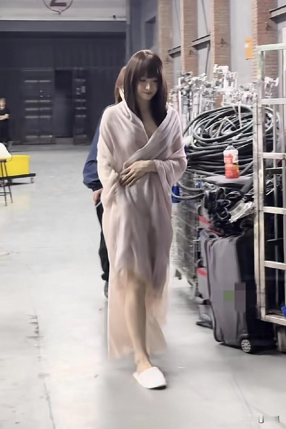 宋茜,披着浅粉色薄纱衣物,脚踩白色拖鞋。